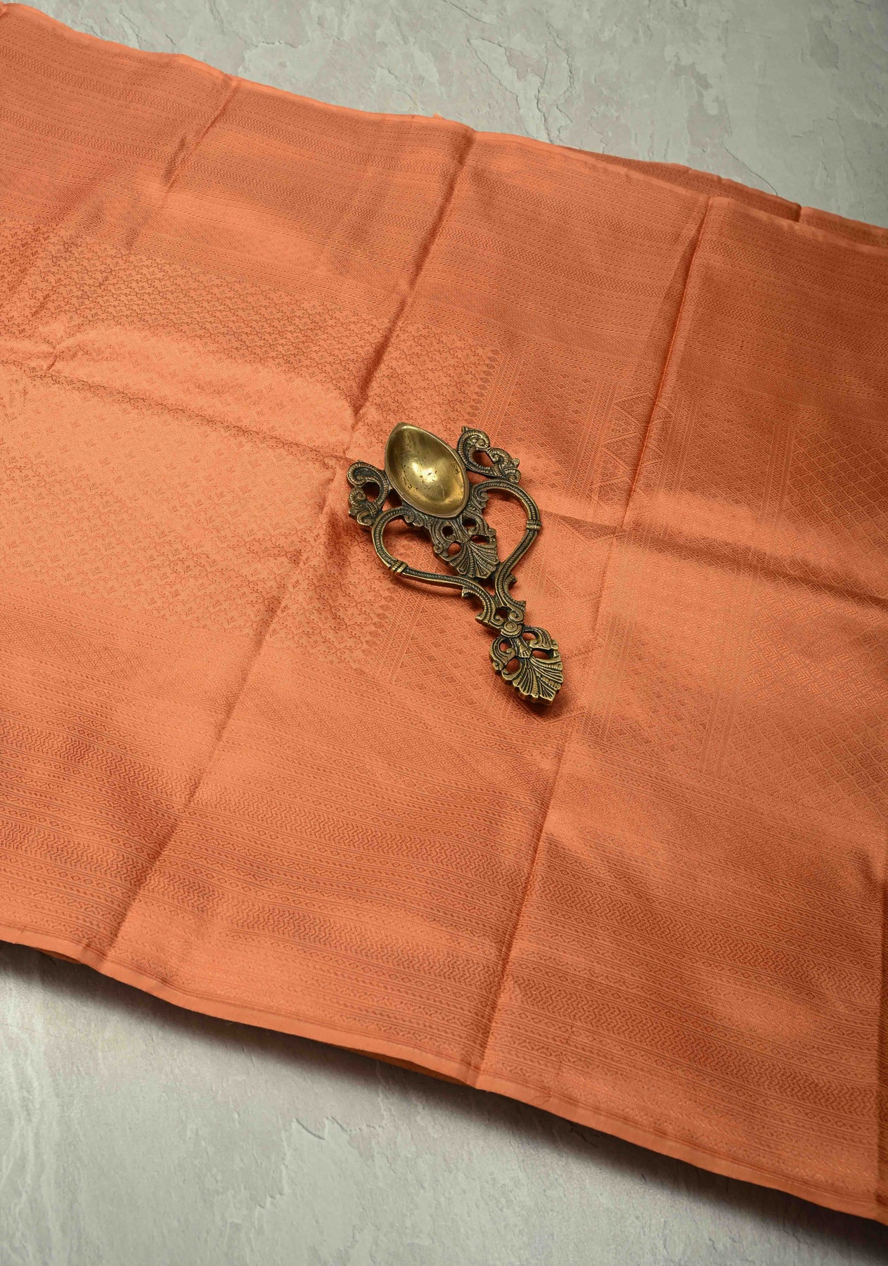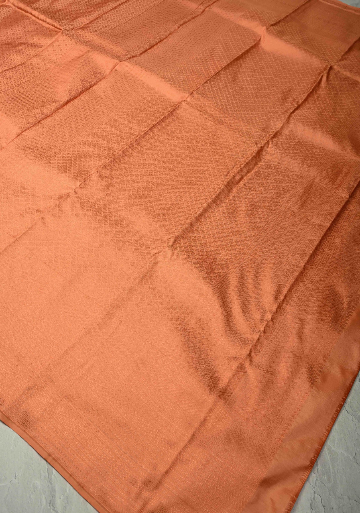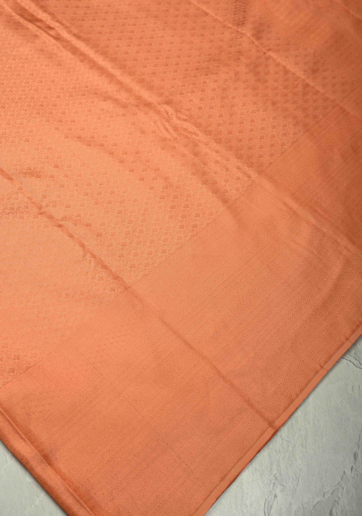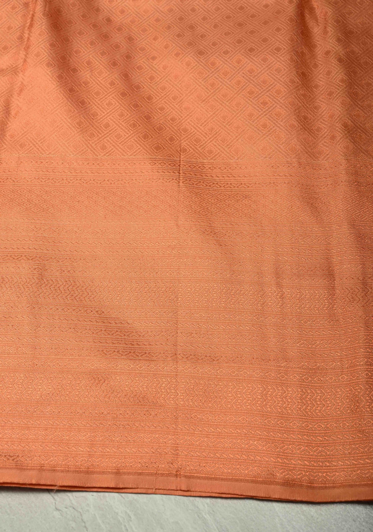 Radiate elegance with this Peach Pure Kanchi Silk Saree, a timeless blend of tradition and sophistication. Handwoven from authentic Kanchipuram silk, it features exquisite brocade motifs that highlight meticulous craftsmanship. The golden zari border and pallu add a regal shimmer, making it perfect for weddings, festive occasions, and grand celebrations. This saree is ideal for anyone seeking a delicate, feminine hue with luxurious artistry.
