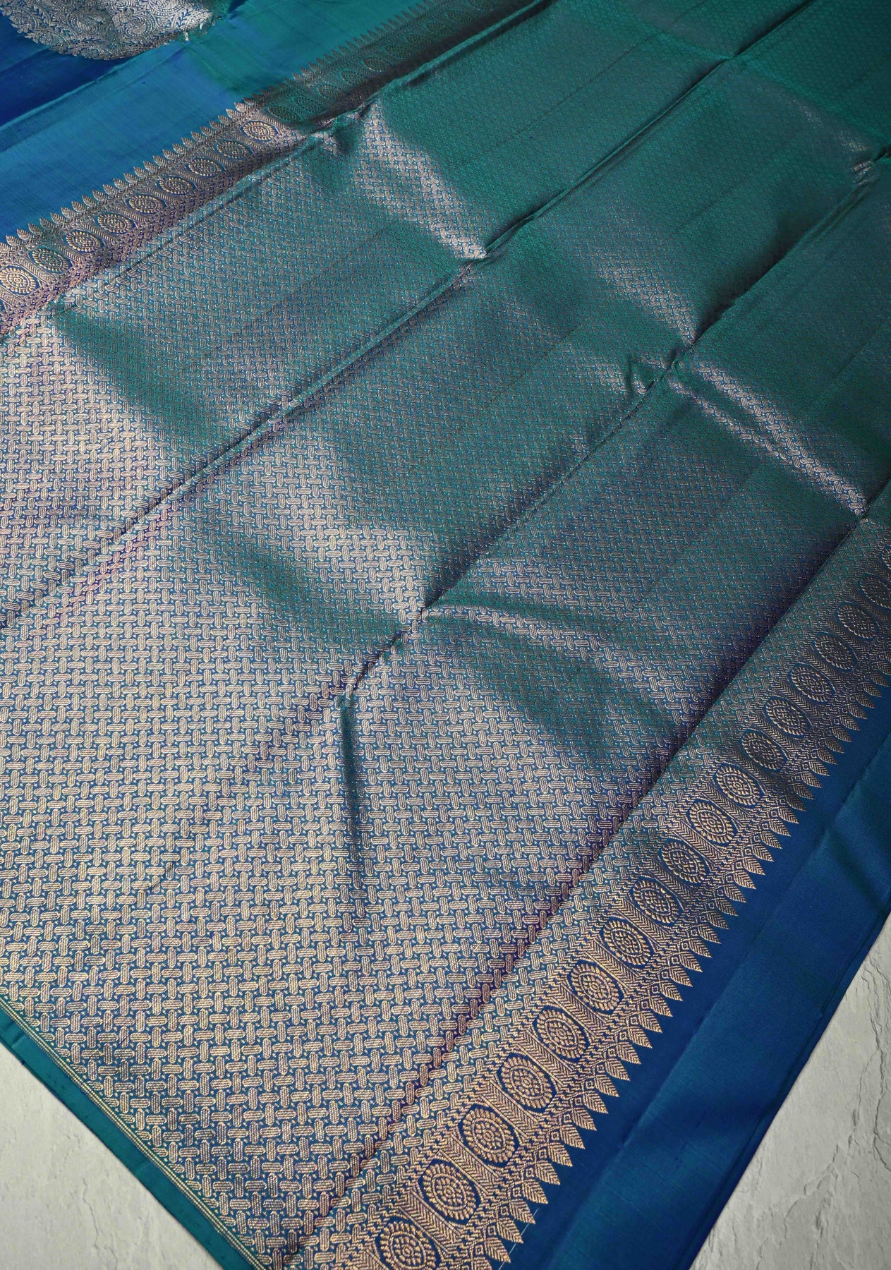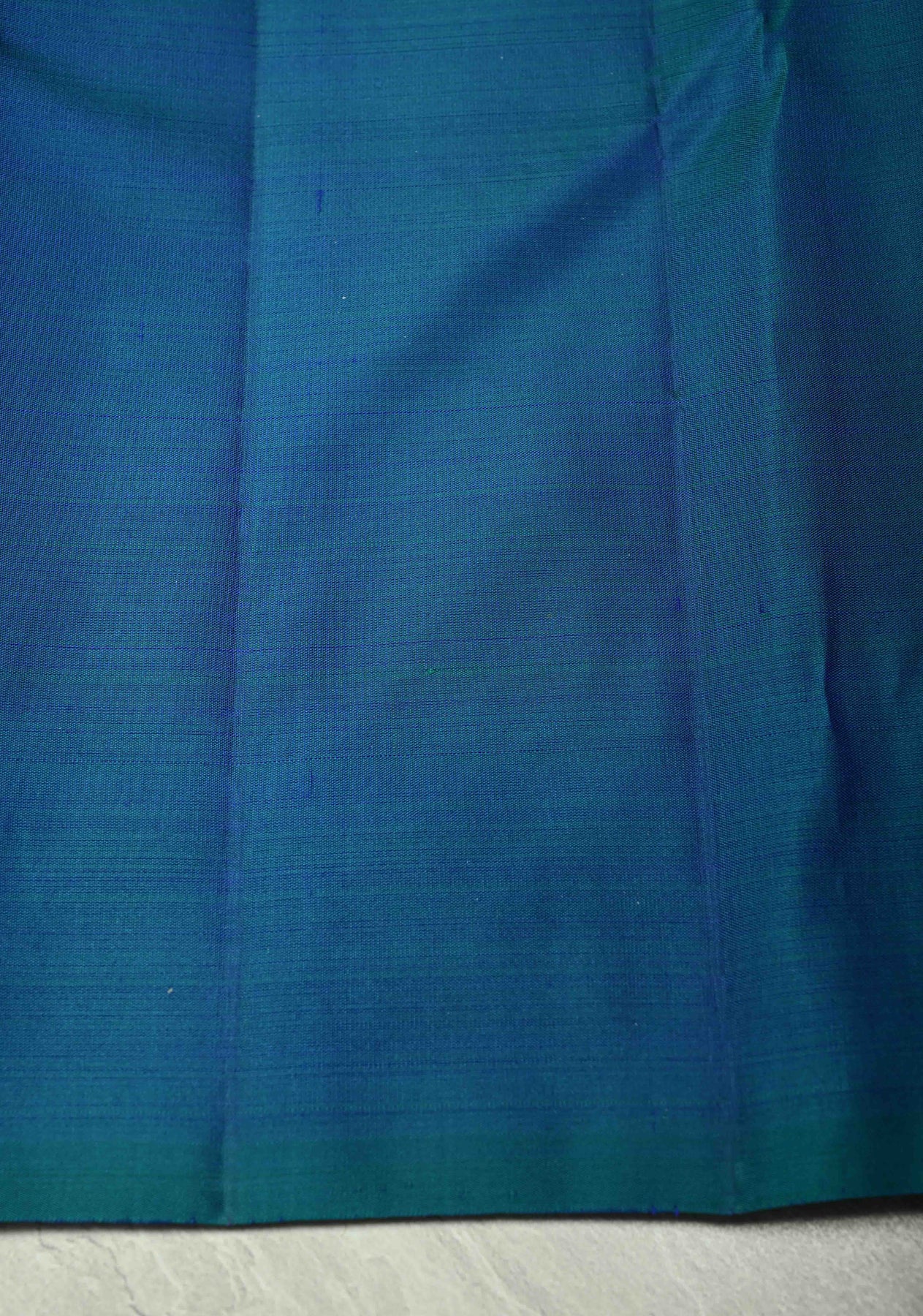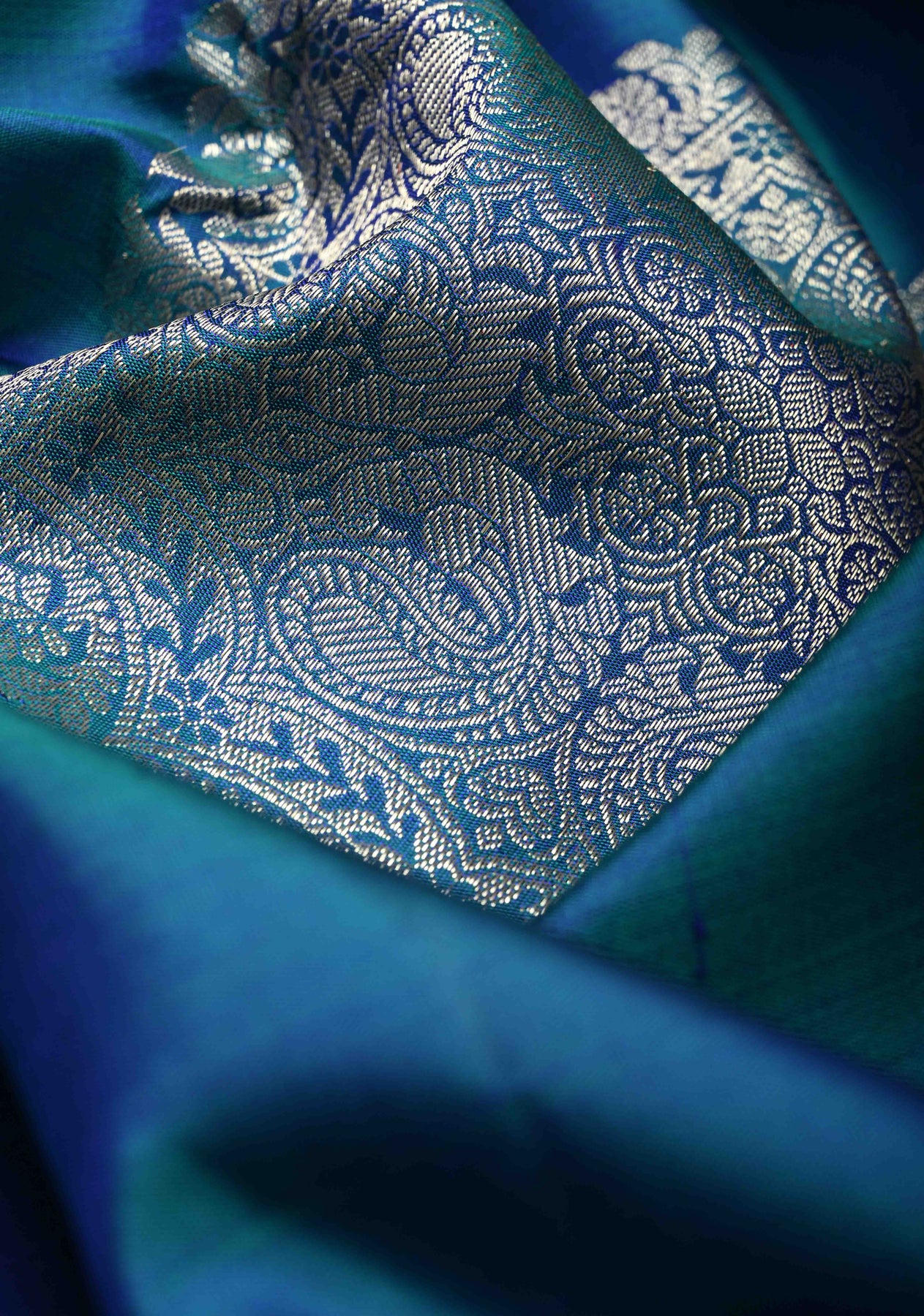 Elevate your wardrobe with this Peacock Blue Green Dual Tone Kanjivaram Silk Saree, a perfect fusion of tradition and modern style. Handwoven from pure Kanchipuram silk, it features delicate Damask motifs throughout, creating a rich, elegant texture. The borderless design adds a contemporary twist, making it ideal for weddings, festive occasions, and cultural celebrations. A timeless saree that showcases heritage craftsmanship with a chic, modern appeal.