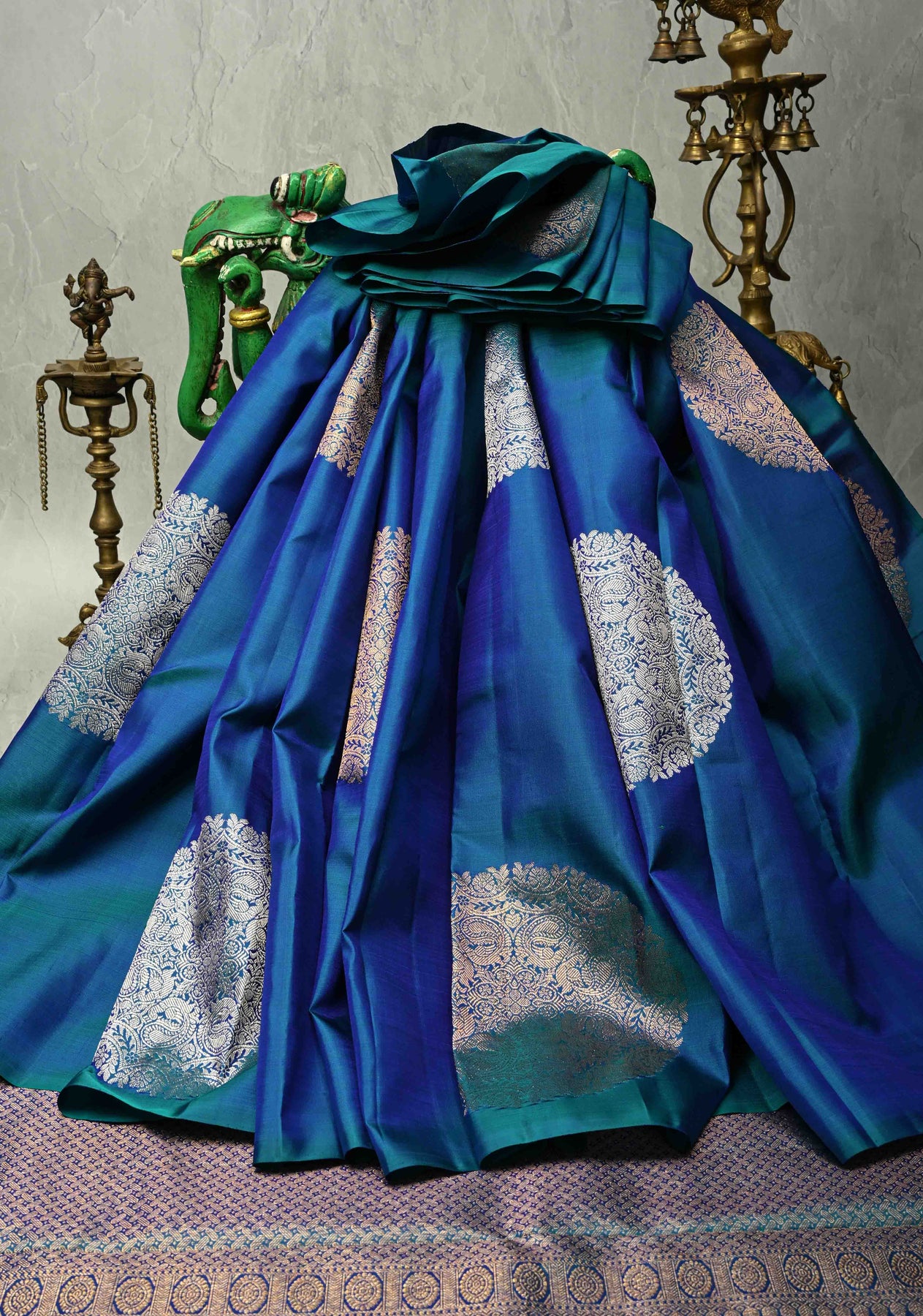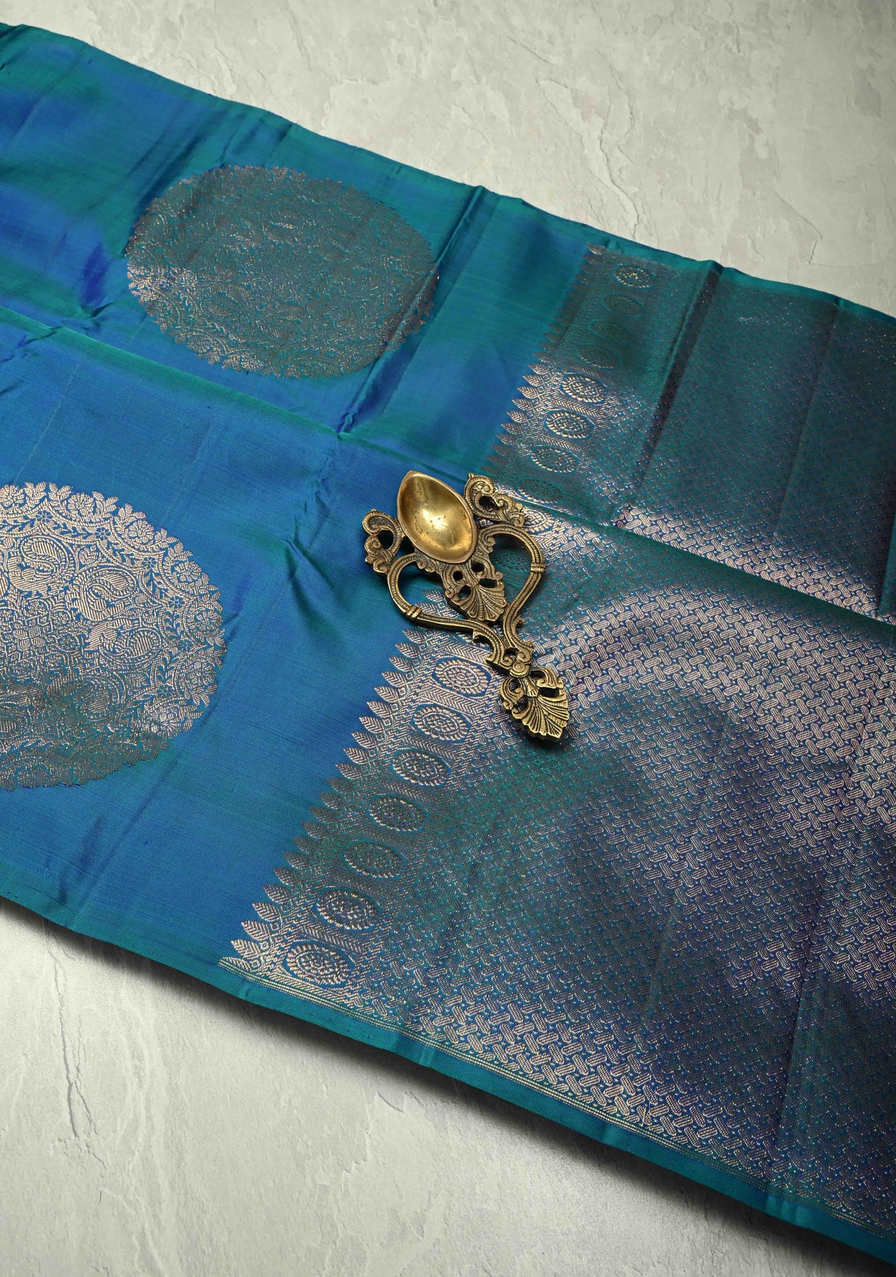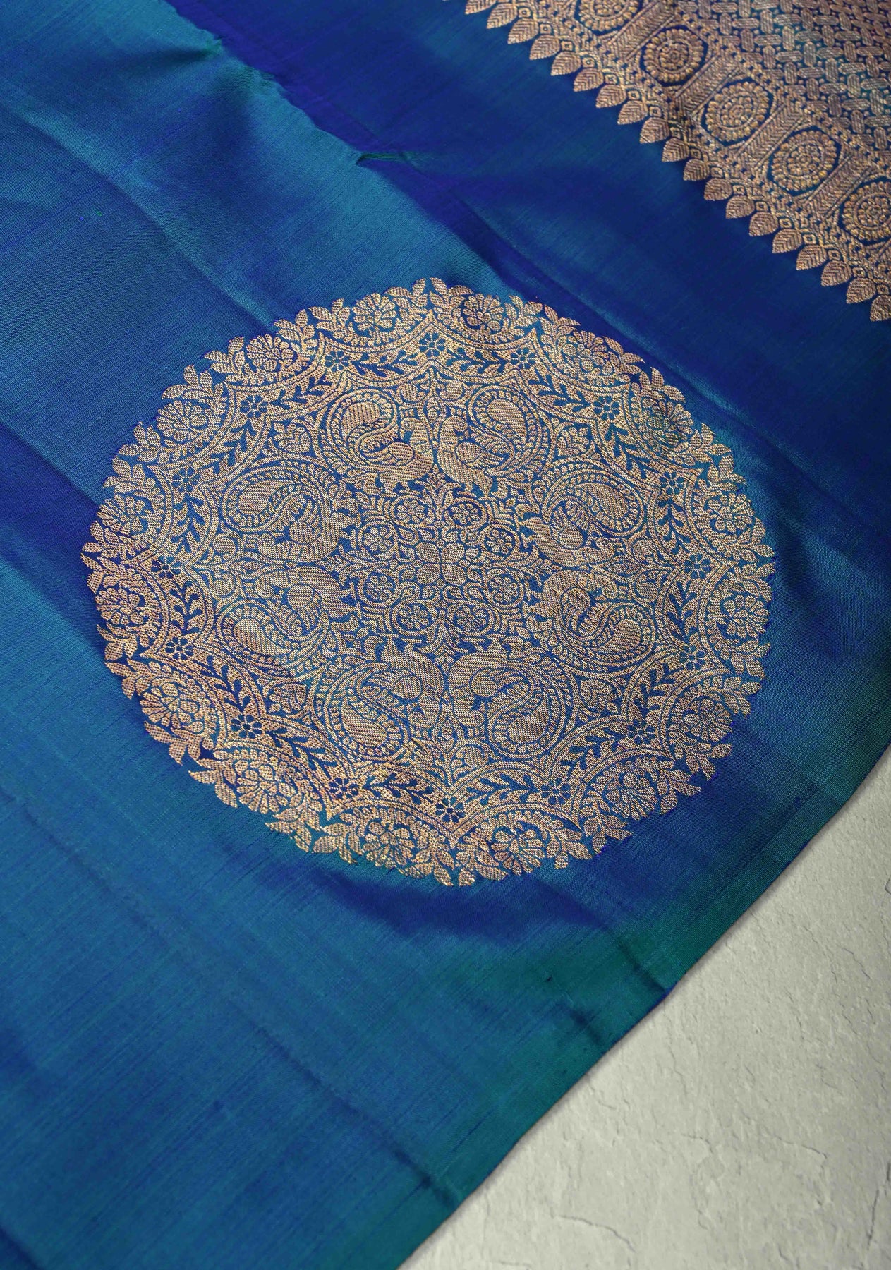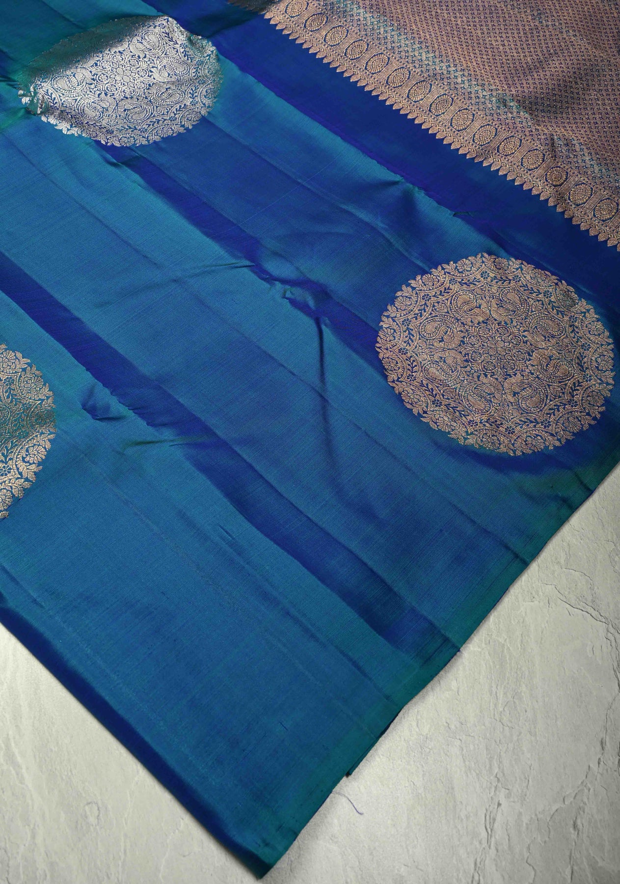 Elevate your wardrobe with this Peacock Blue Green Dual Tone Kanjivaram Silk Saree, a perfect fusion of tradition and modern style. Handwoven from pure Kanchipuram silk, it features delicate Damask motifs throughout, creating a rich, elegant texture. The borderless design adds a contemporary twist, making it ideal for weddings, festive occasions, and cultural celebrations. A timeless saree that showcases heritage craftsmanship with a chic, modern appeal.