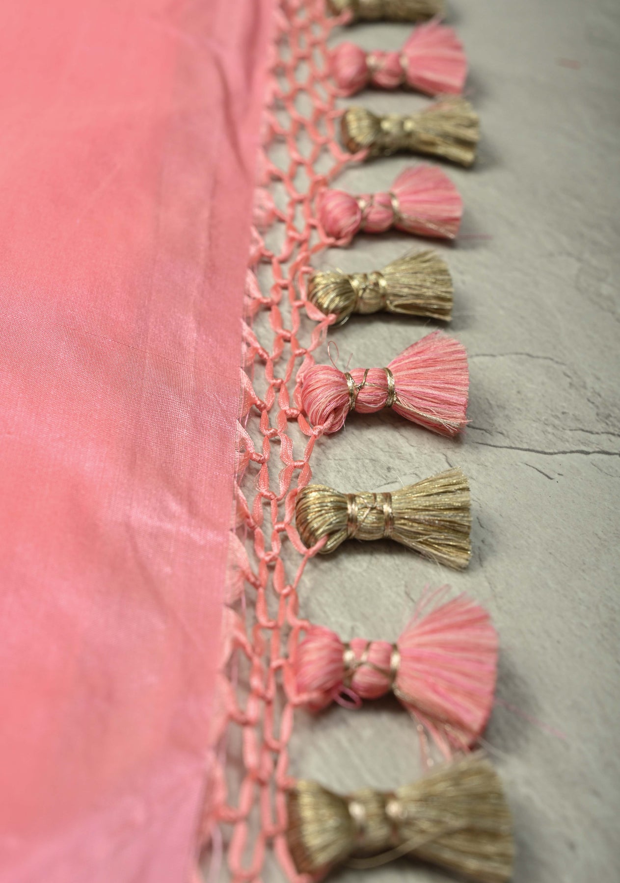 This saree is ready to wear with fall and pico done. Handmade silk tassels adorn the pallu and add more grace to it. An unstitched blouse fabric is included.