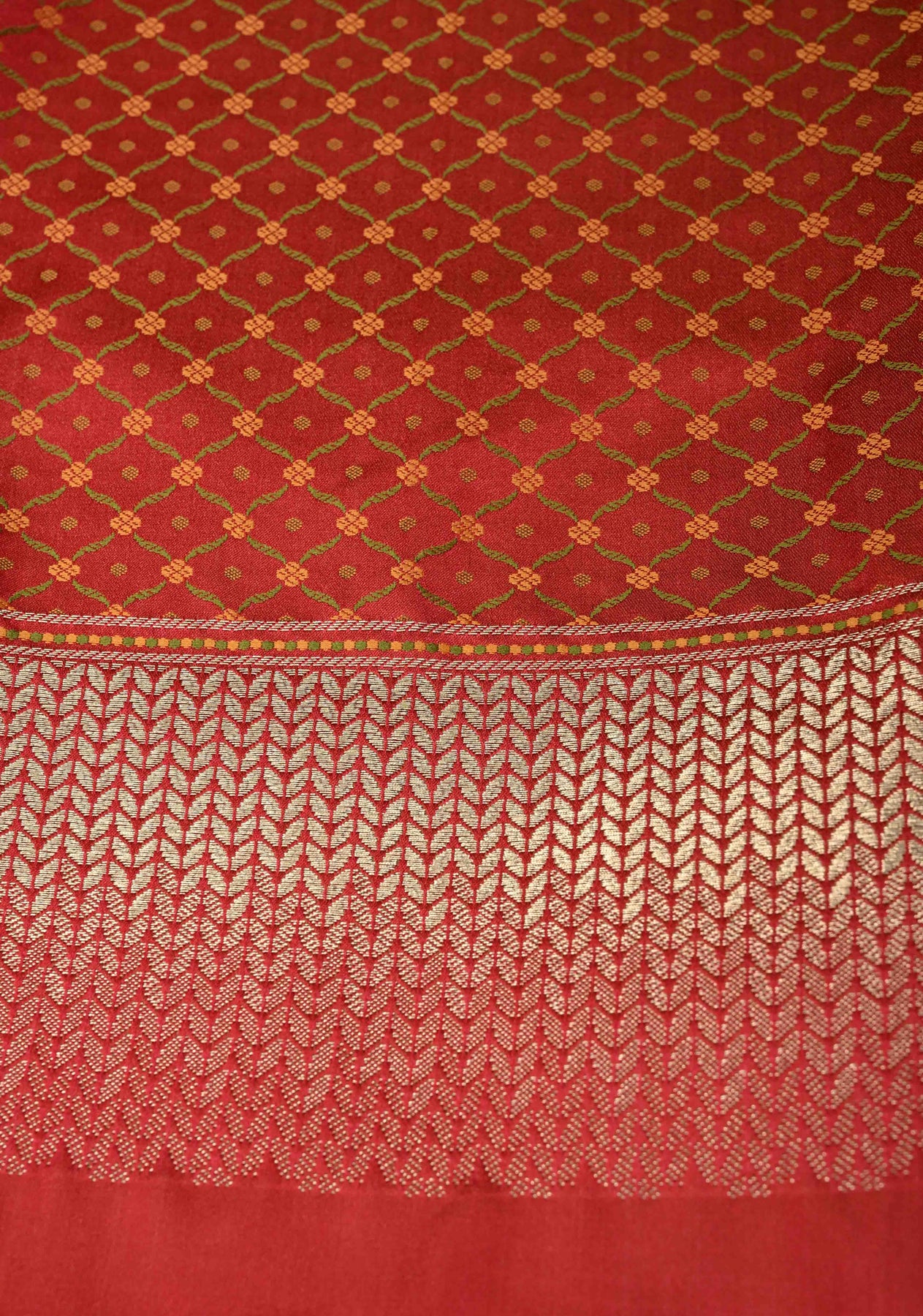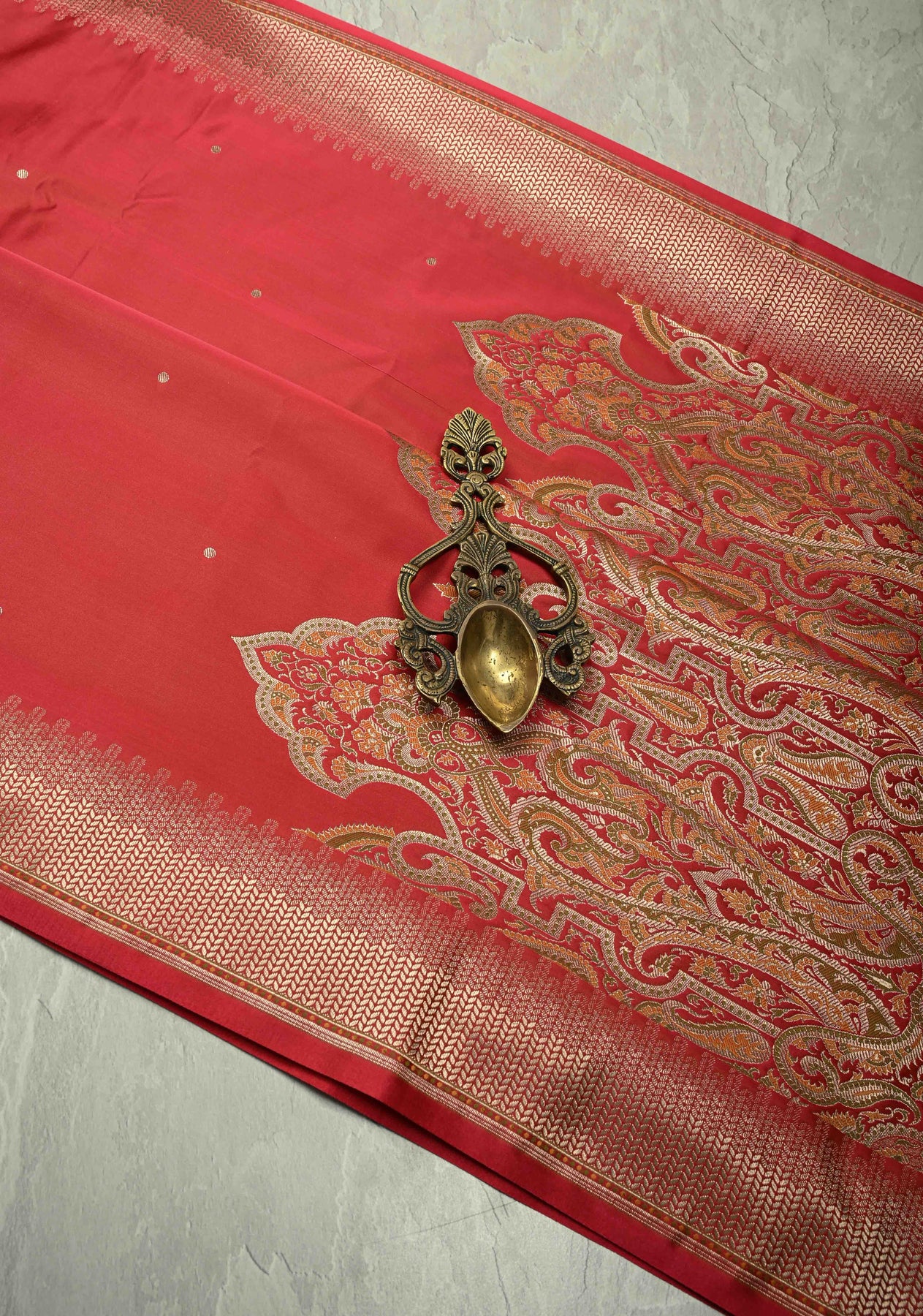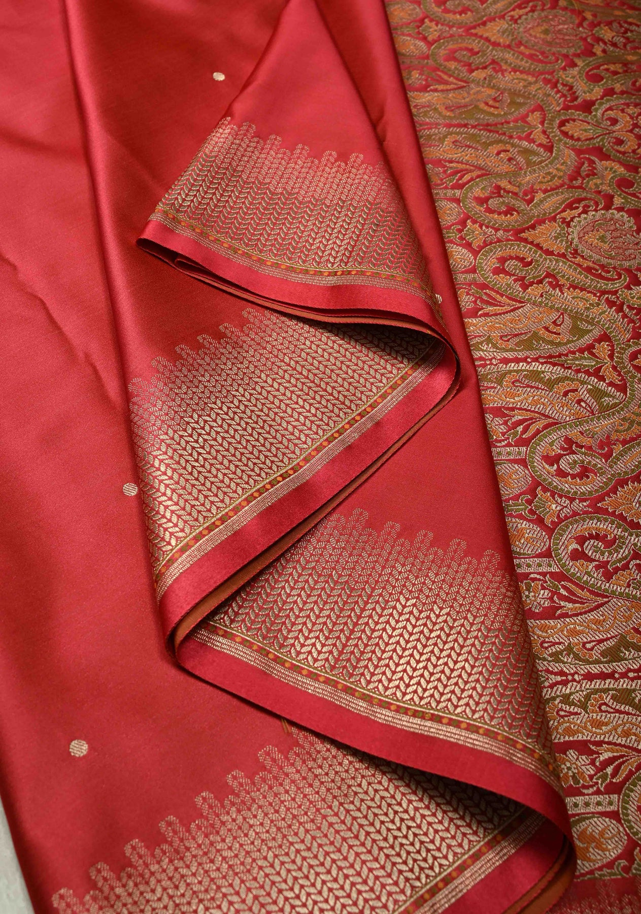 Make a statement in this Pink-Red Dual Tone Banarasi Semi Mashru Silk Saree, a perfect blend of tradition and contemporary elegance. Crafted from semi mashru silk, this saree features delicate silver zari buttis scattered across the body and a rich silver zari border, giving it a shimmer.
