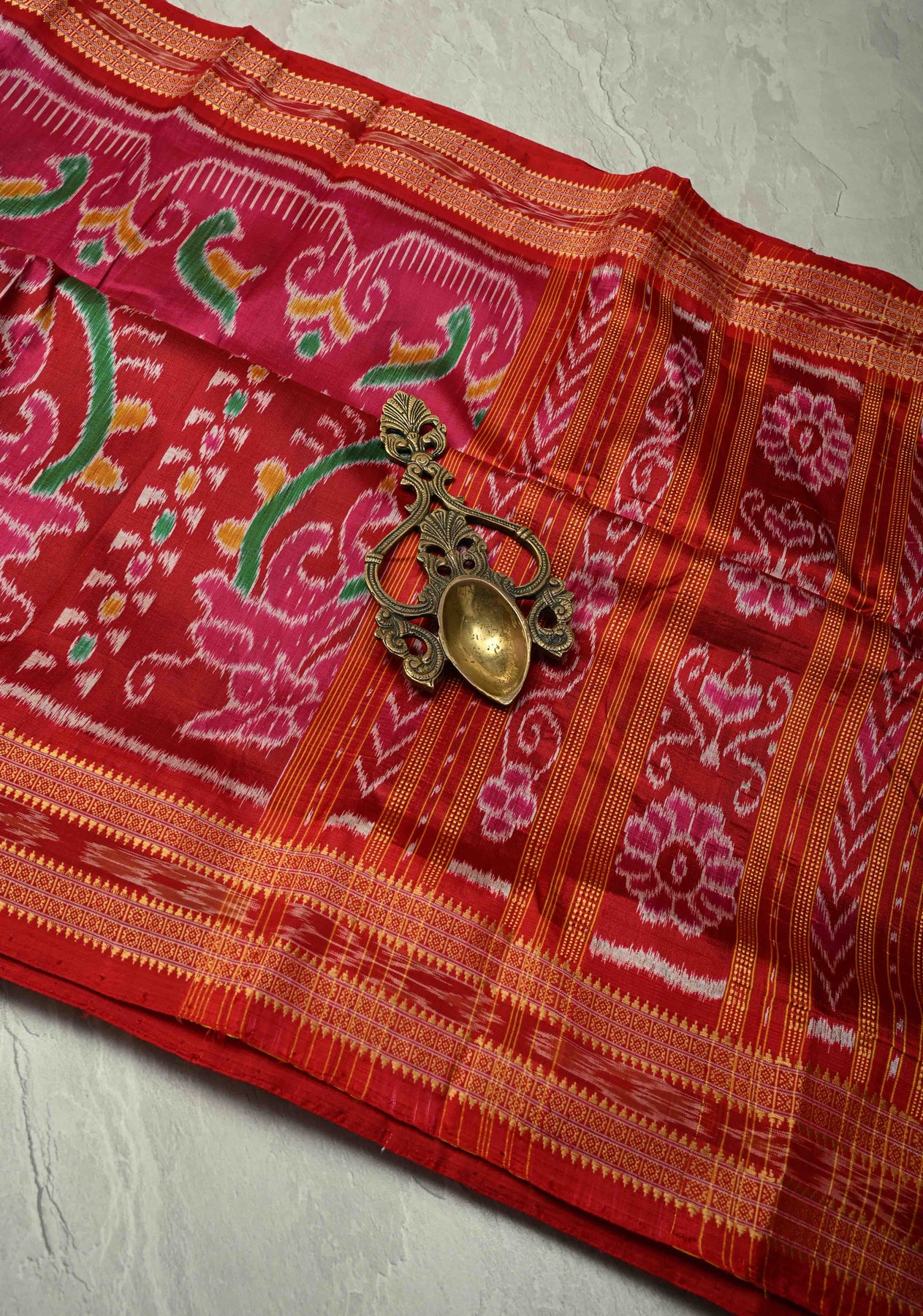 This Pink-Red Handloom Sambalpuri Ikkat Silk Saree with Ikkat Weave and Zari Border is a vibrant celebration of Odisha’s rich textile heritage. Handwoven from silk, it features the traditional Sambalpuri Ikkat technique, creating intricate geometric patterns in striking pink and red hues. The delicate zari border enhances the saree’s elegance, adding a subtle shimmer to its rich texture. Lightweight, soft, and gracefully draping, this saree is perfect for weddings, festive occasions, and cultural celebrations, making it a timeless and eye-catching addition to any ethnic wardrobe.