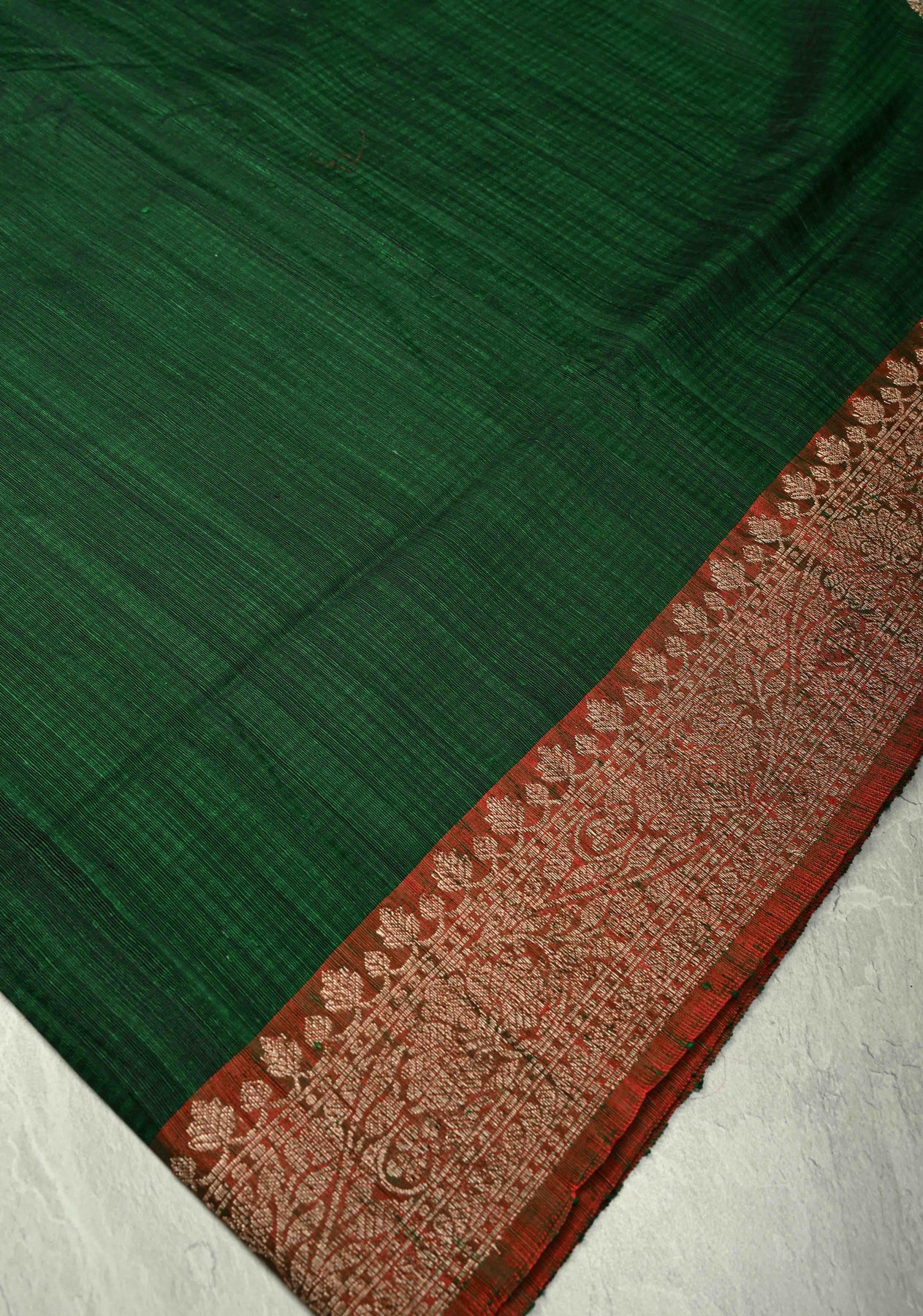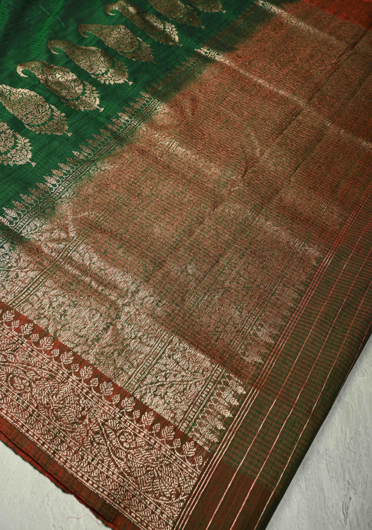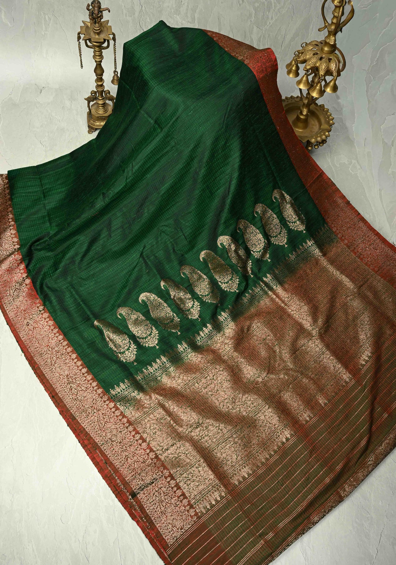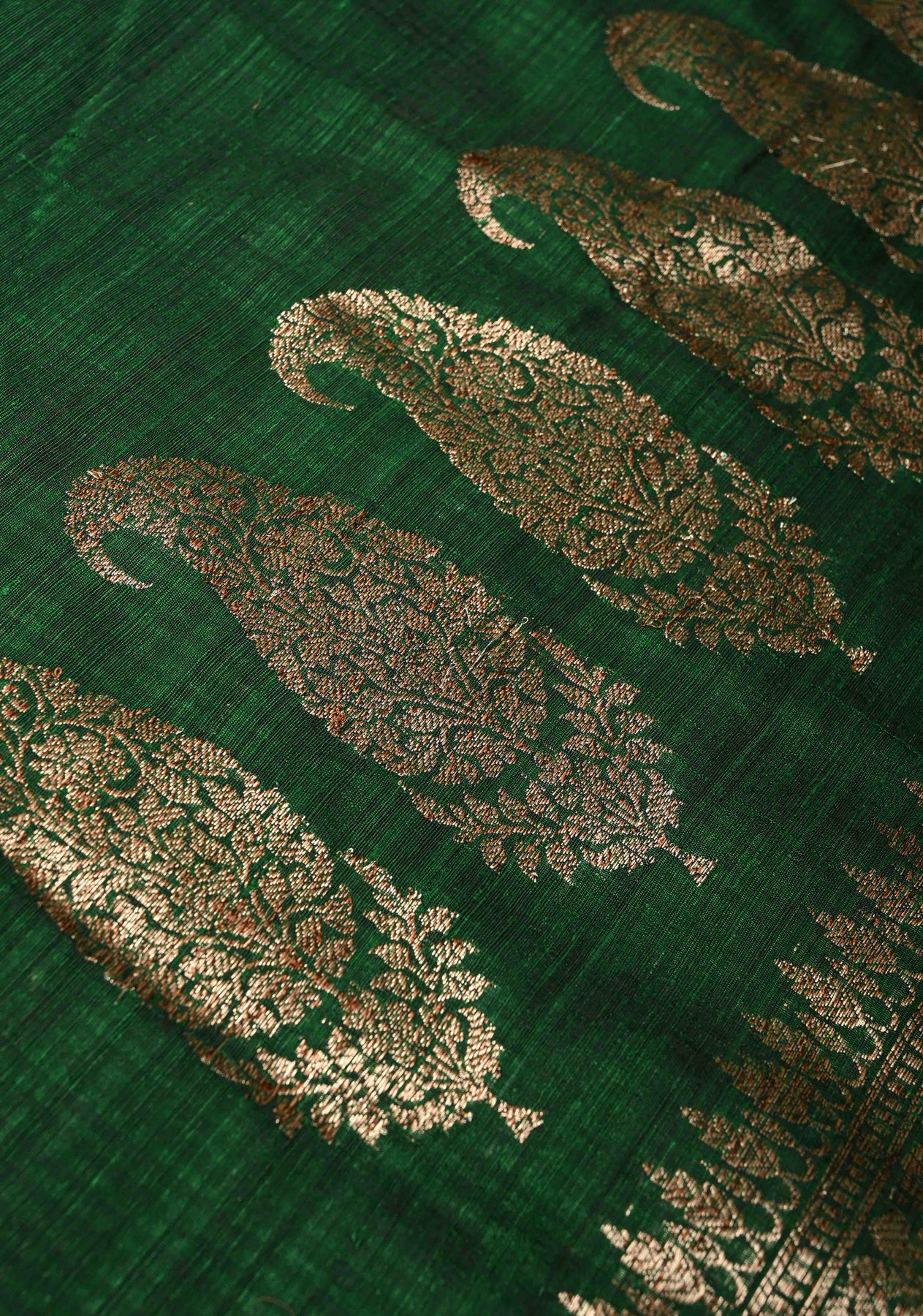 This Pure Banarasi Dupion Silk Saree in Forest Green is a celebration of classic elegance and timeless craftsmanship. Woven from Dupion silk, it features intricate antique zari paisley buttas meticulously scattered across the fabric, adding a regal shimmer and traditional charm. The rich forest green hue is beautifully complemented by a finely woven zari border, enhancing the saree’s grandeur. Perfect for weddings, festive occasions, and special celebrations, this saree embodies the unmatched artistry and heritage of Banarasi weaving.