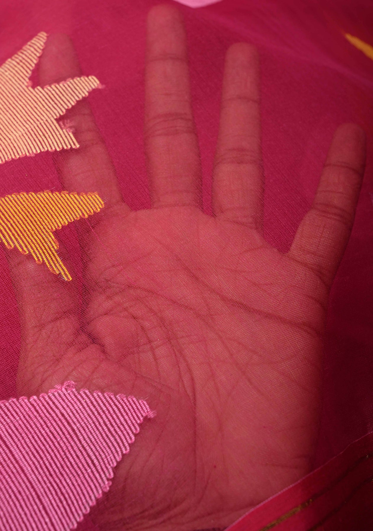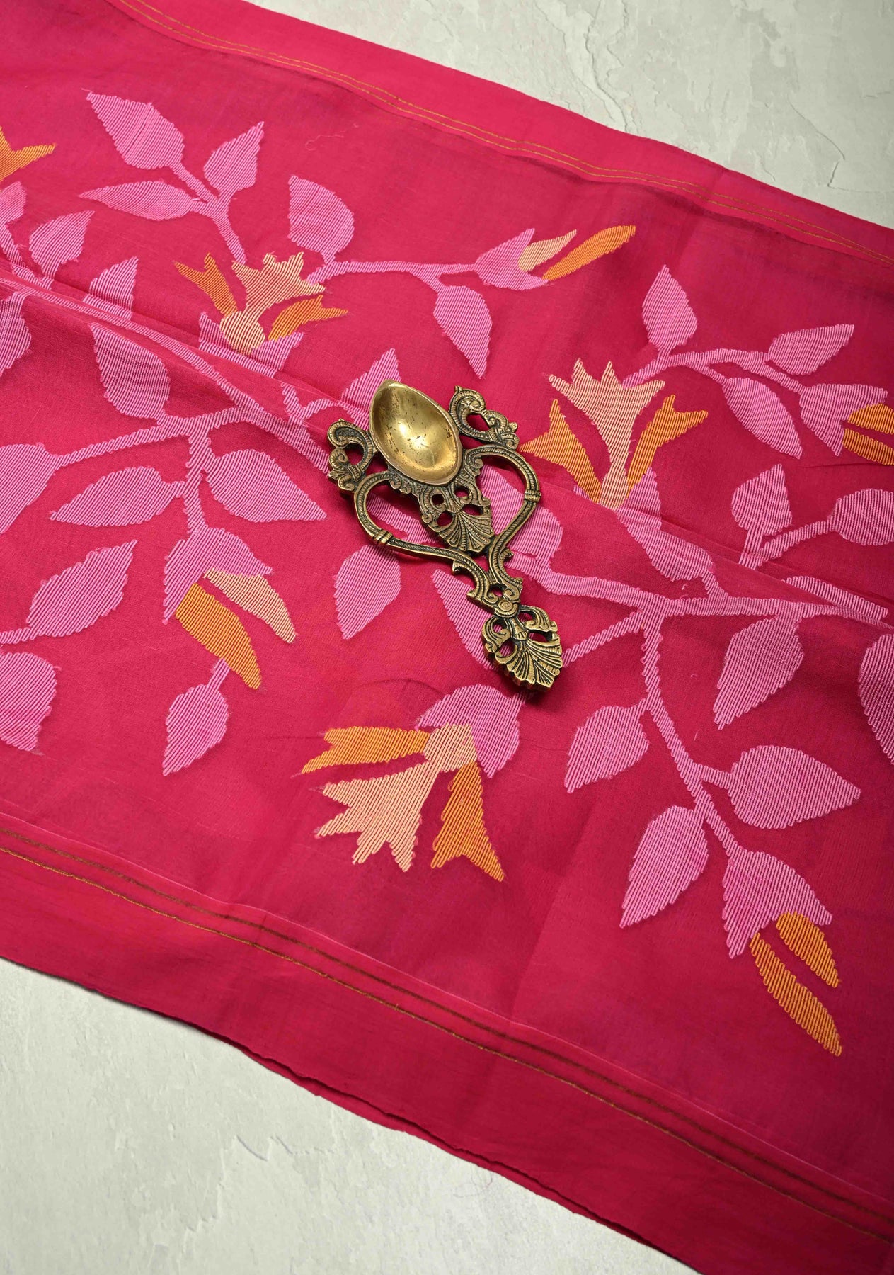Drape yourself in regal elegance with this stunning Rani Pink Muslin Silk Saree, adorned with intricate Meenakari designs and exquisite Resham Jamdani weaving. Crafted by skilled artisans, the saree showcases a perfect blend of traditional artistry and contemporary sophistication.