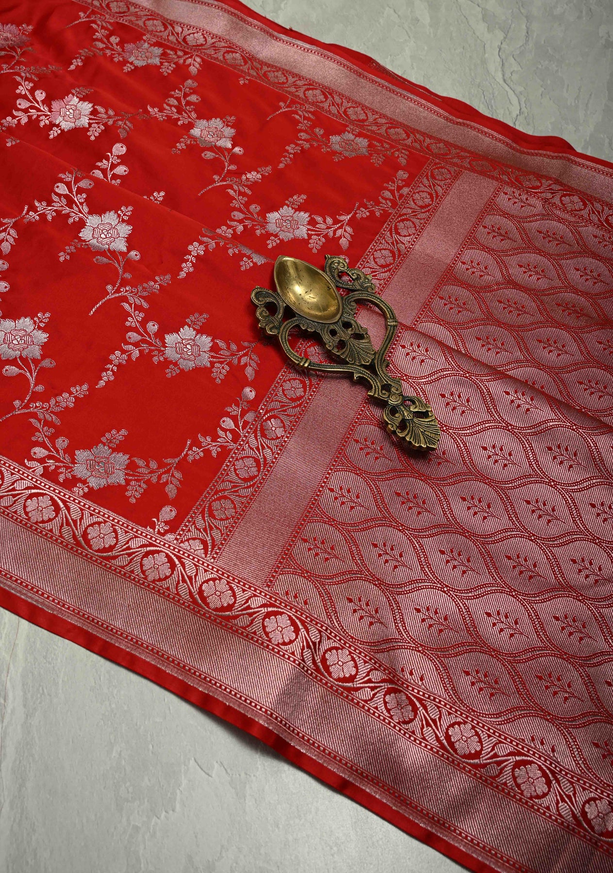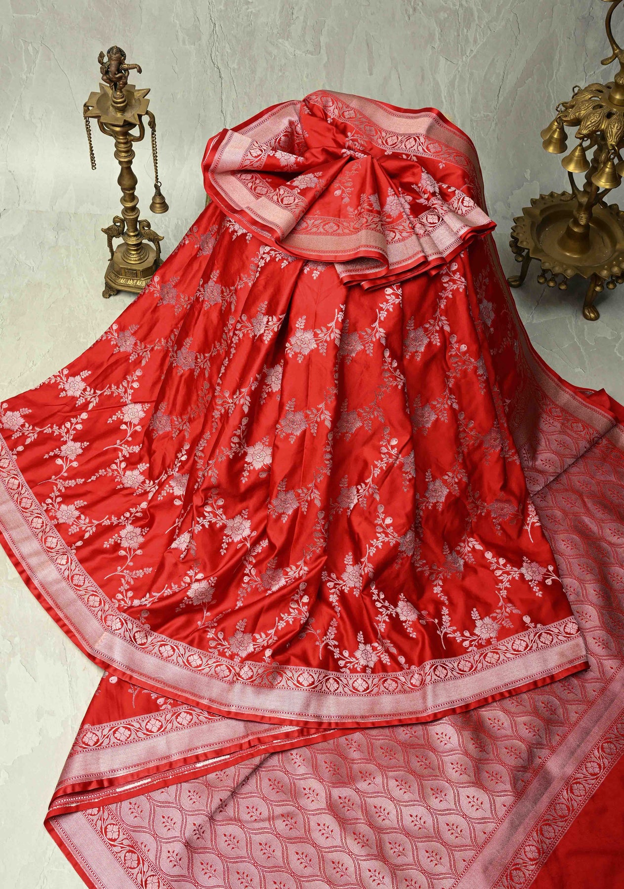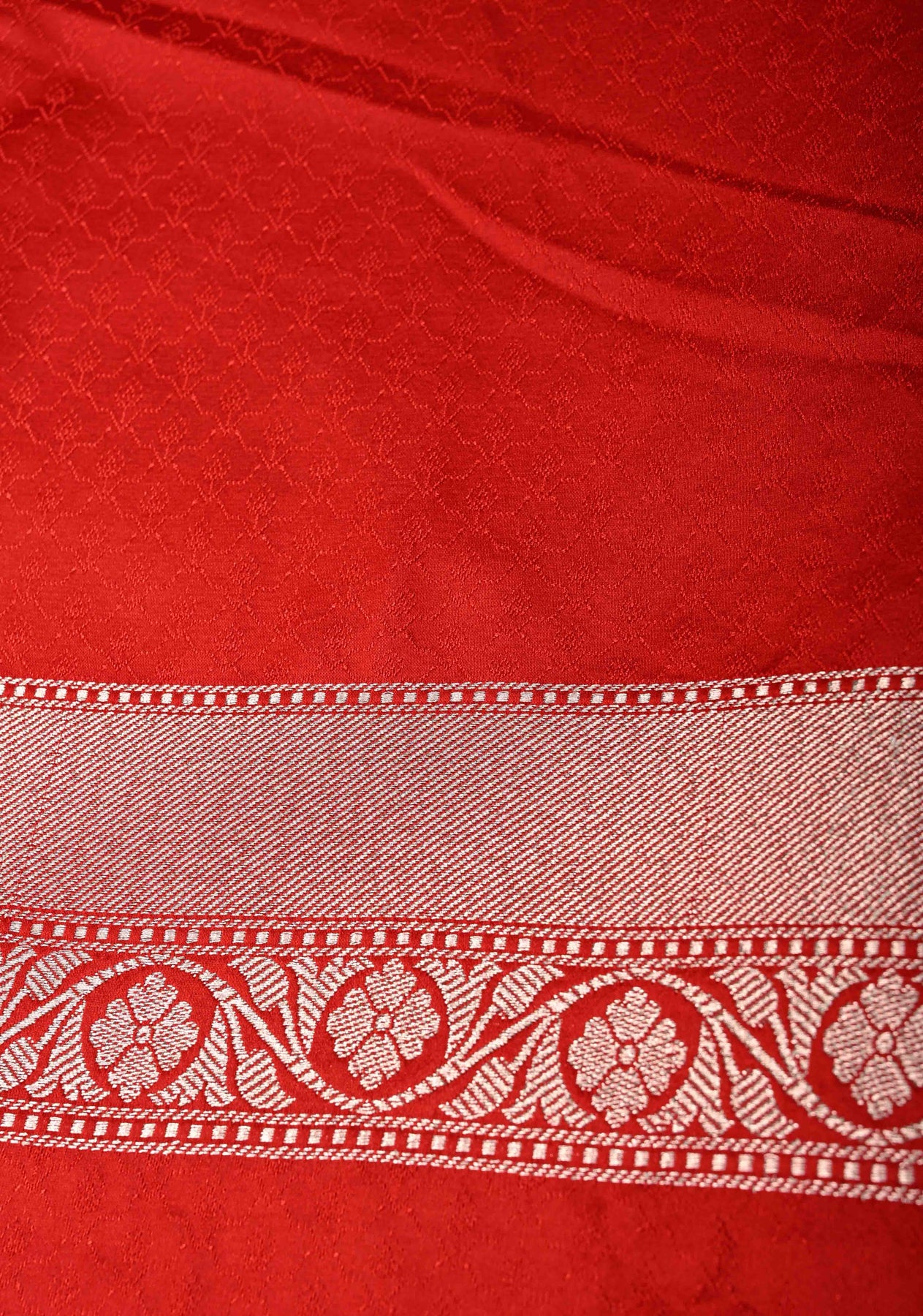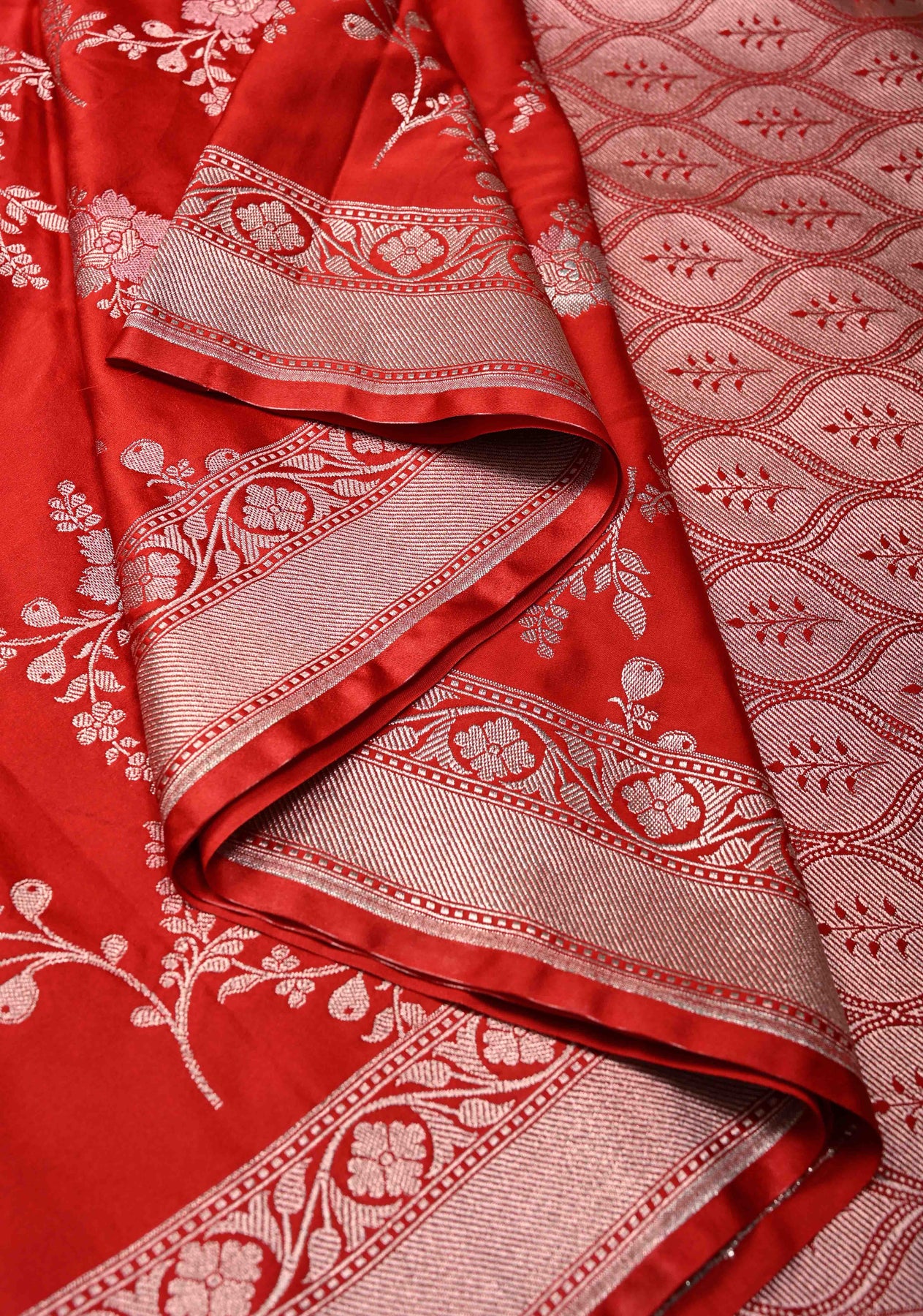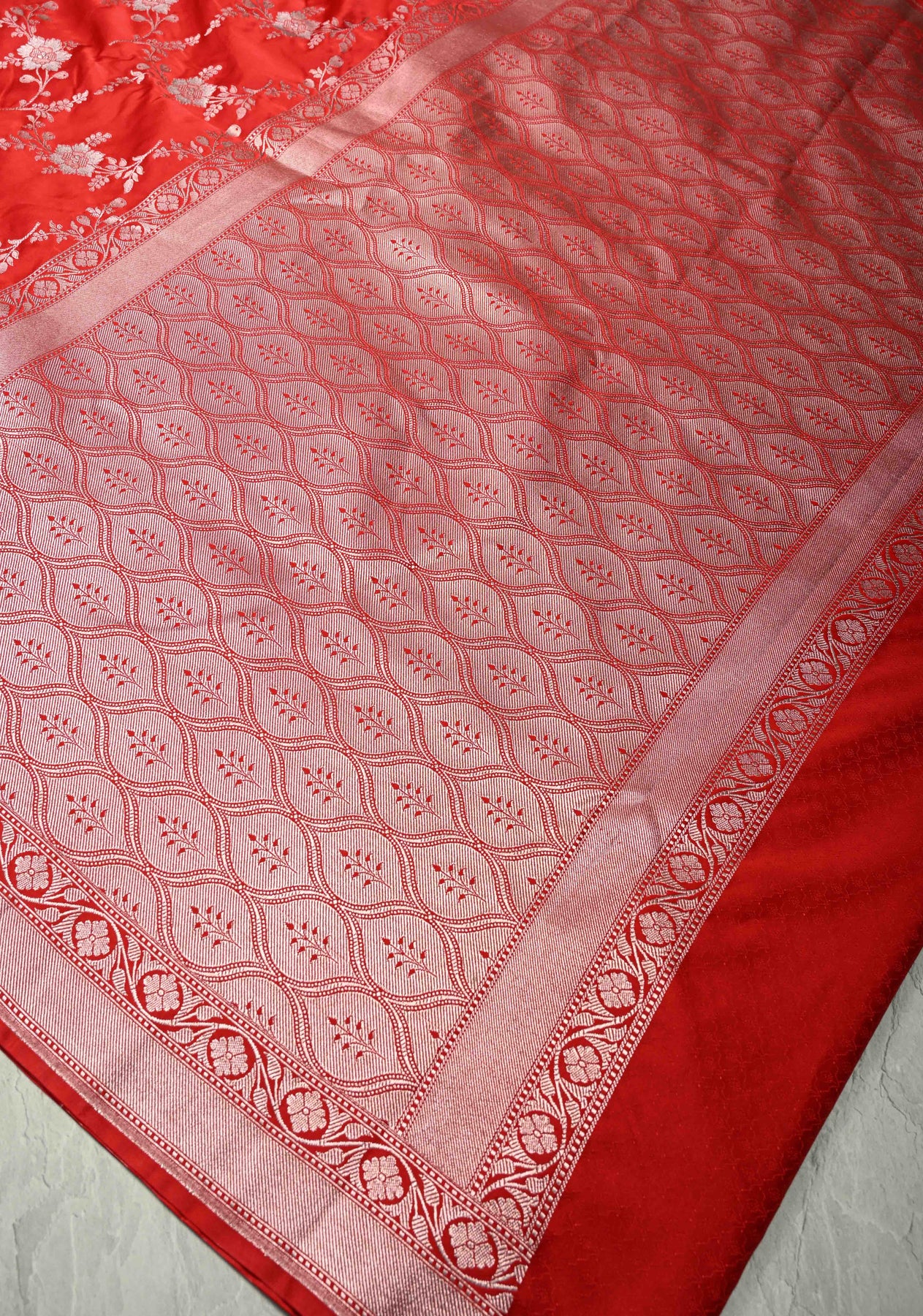 Red Banarasi Semi Mashru Silk Saree with alfi Floral Jaal and Zari Border