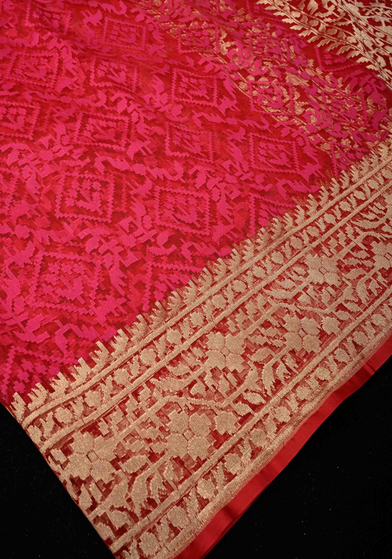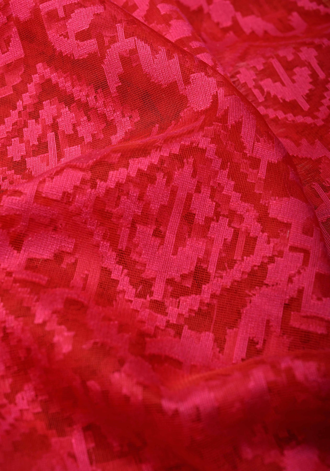 This Red-Pink Elegant Banarasi Handloom Net Saree in Jamdhani style is a stunning fusion of tradition and grace. Crafted with intricate Jamdhani weaving, it showcases delicate floral and vine motifs that shimmer beautifully against the sheer net fabric. The dual-tone red and pink hues create a radiant, festive charm, while the soft texture ensures effortless draping. Perfect for weddings, festive gatherings, or evening occasions, this saree exudes timeless Banarasi artistry blended with modern sophistication. Pair it with a matching blouse and statement jewelry for a captivating ethnic look.