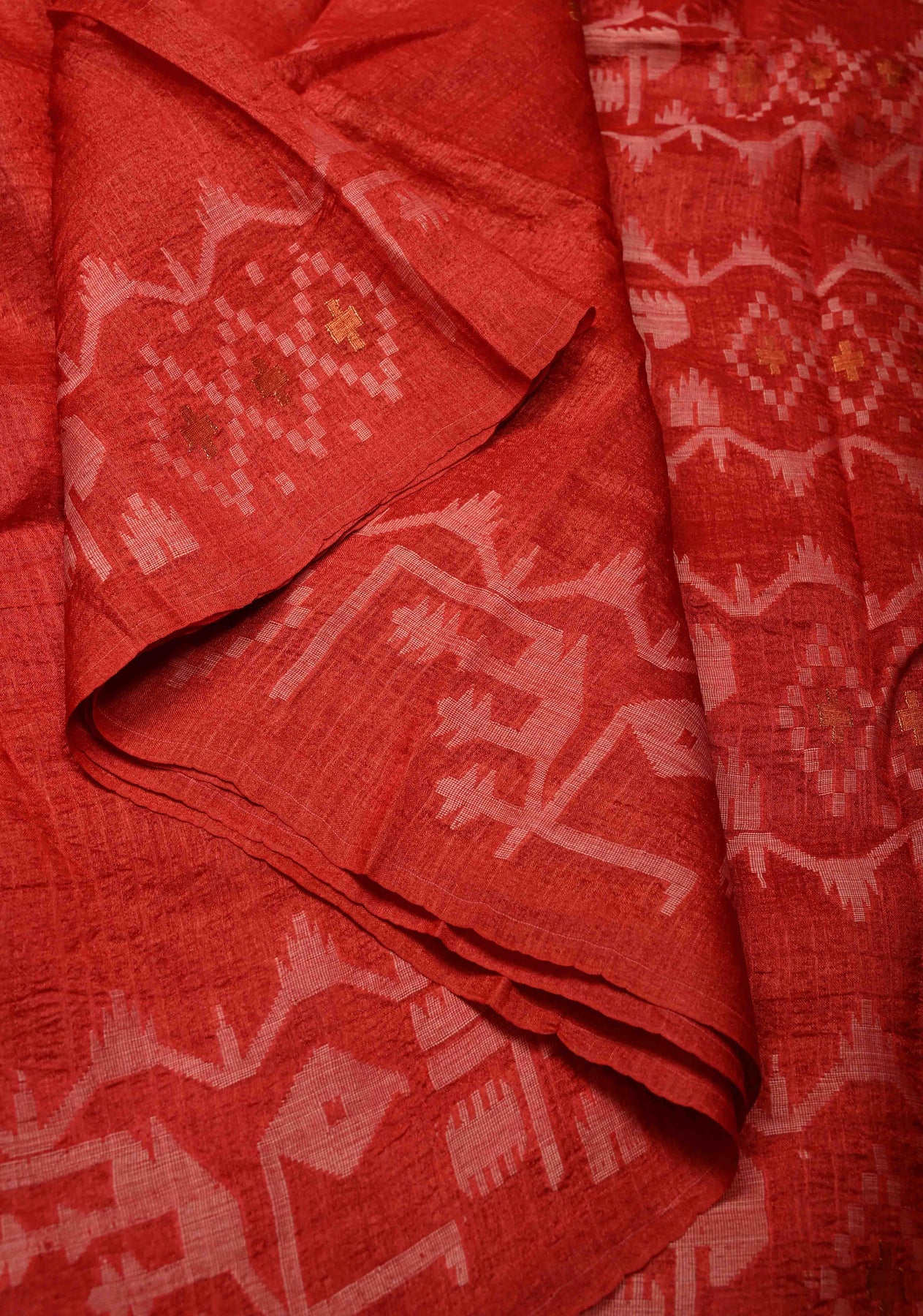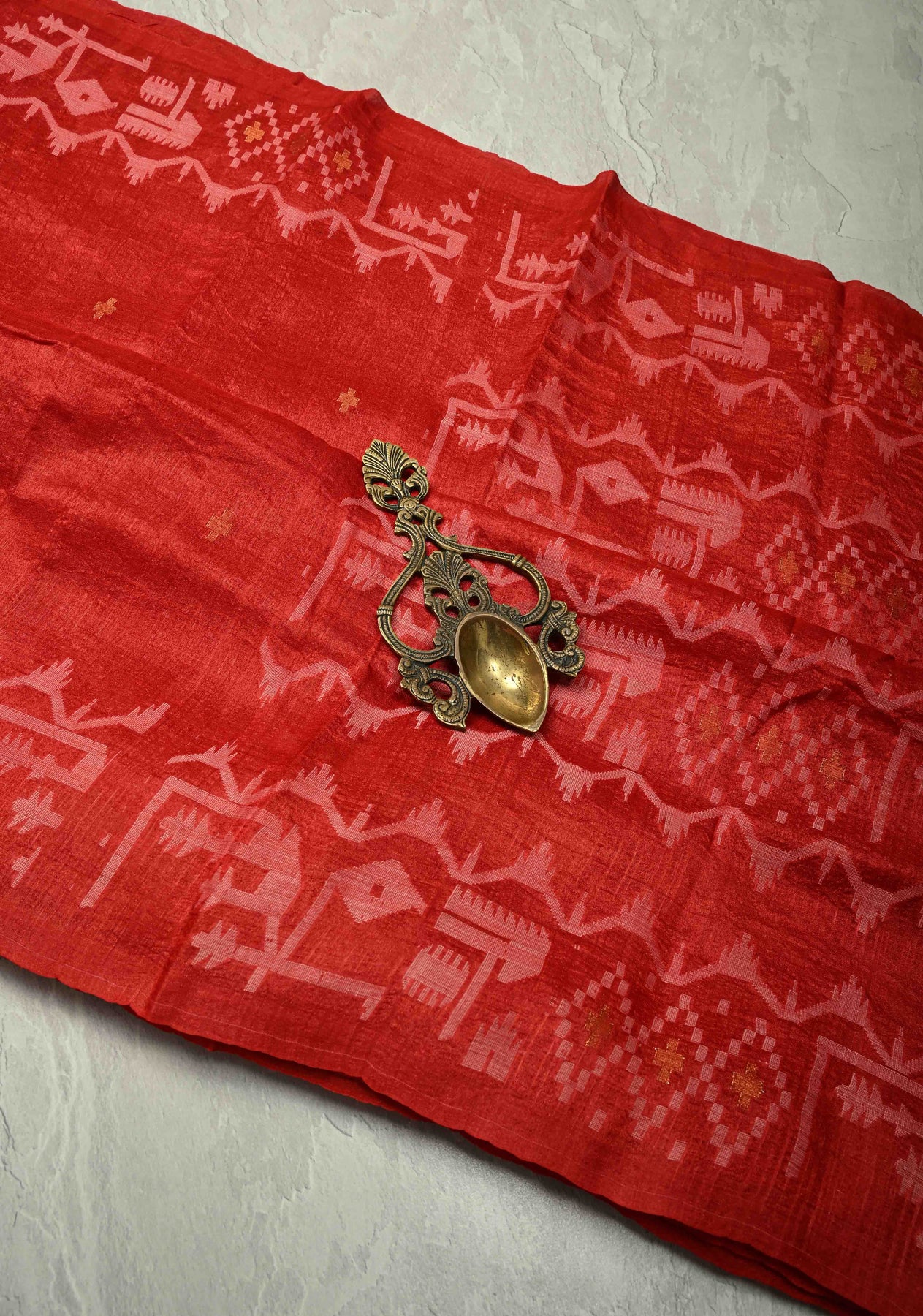 Radiate timeless elegance with this exquisite Red Tussar Silk Saree, beautifully adorned with intricate Resham and Zari detailing. Handwoven from premium Tussar silk, this saree showcases a natural sheen and a rich texture that reflect traditional Indian artistry.