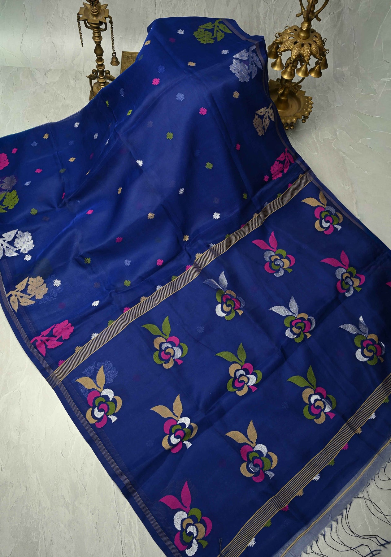 The deep royal blue hue exudes regality, while the fine Resham Jamdani patterns and Meenakari detailing add a luxurious, festive touch. Perfect for weddings, cultural events, and celebratory occasions, this saree drapes gracefully, offering timeless charm and refinement