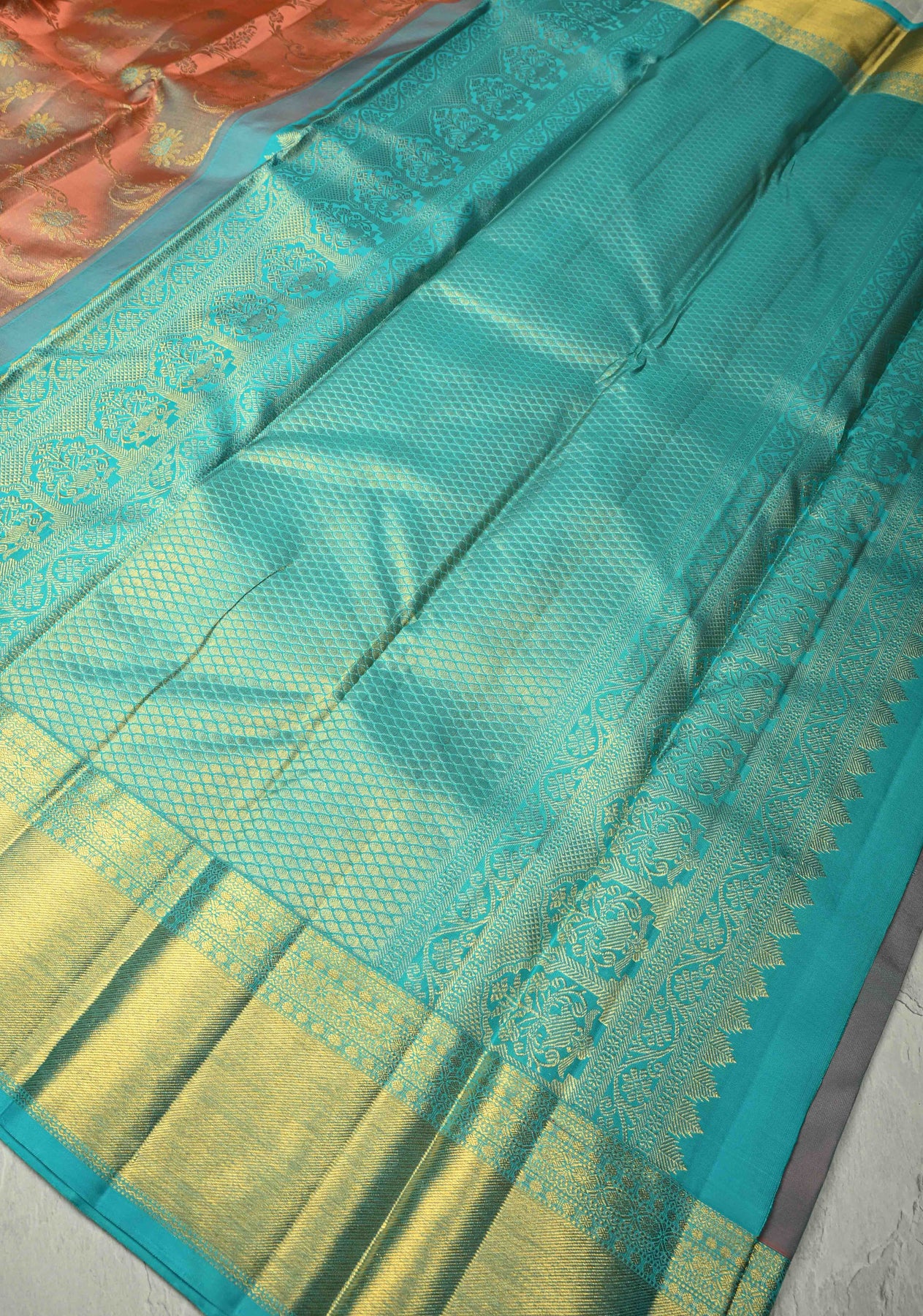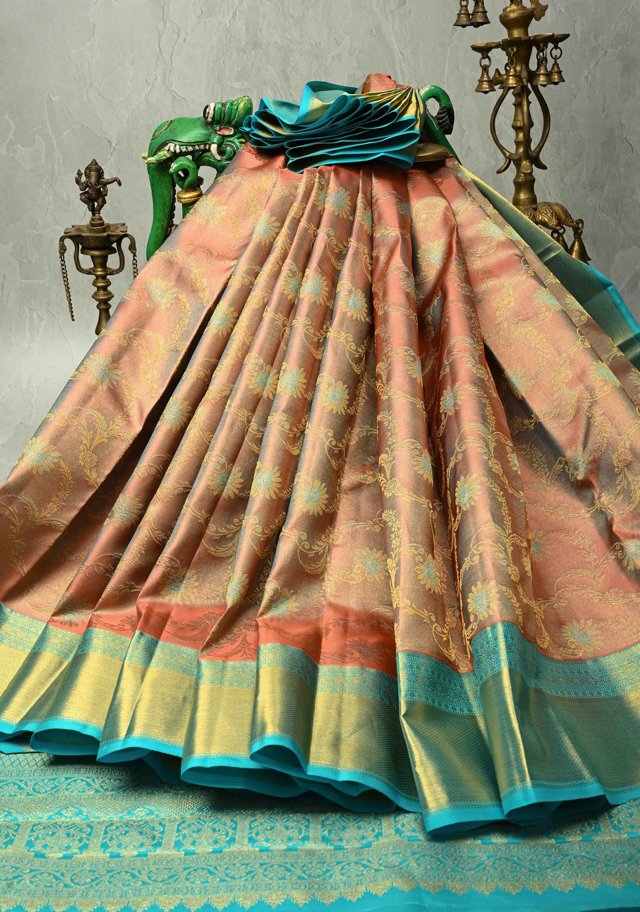 Salmon Pink Kanjivaram Tissue Silk Saree with Meenakari Floral Jaal and Contrast Zari Border | SILK MARK CERTIFIED