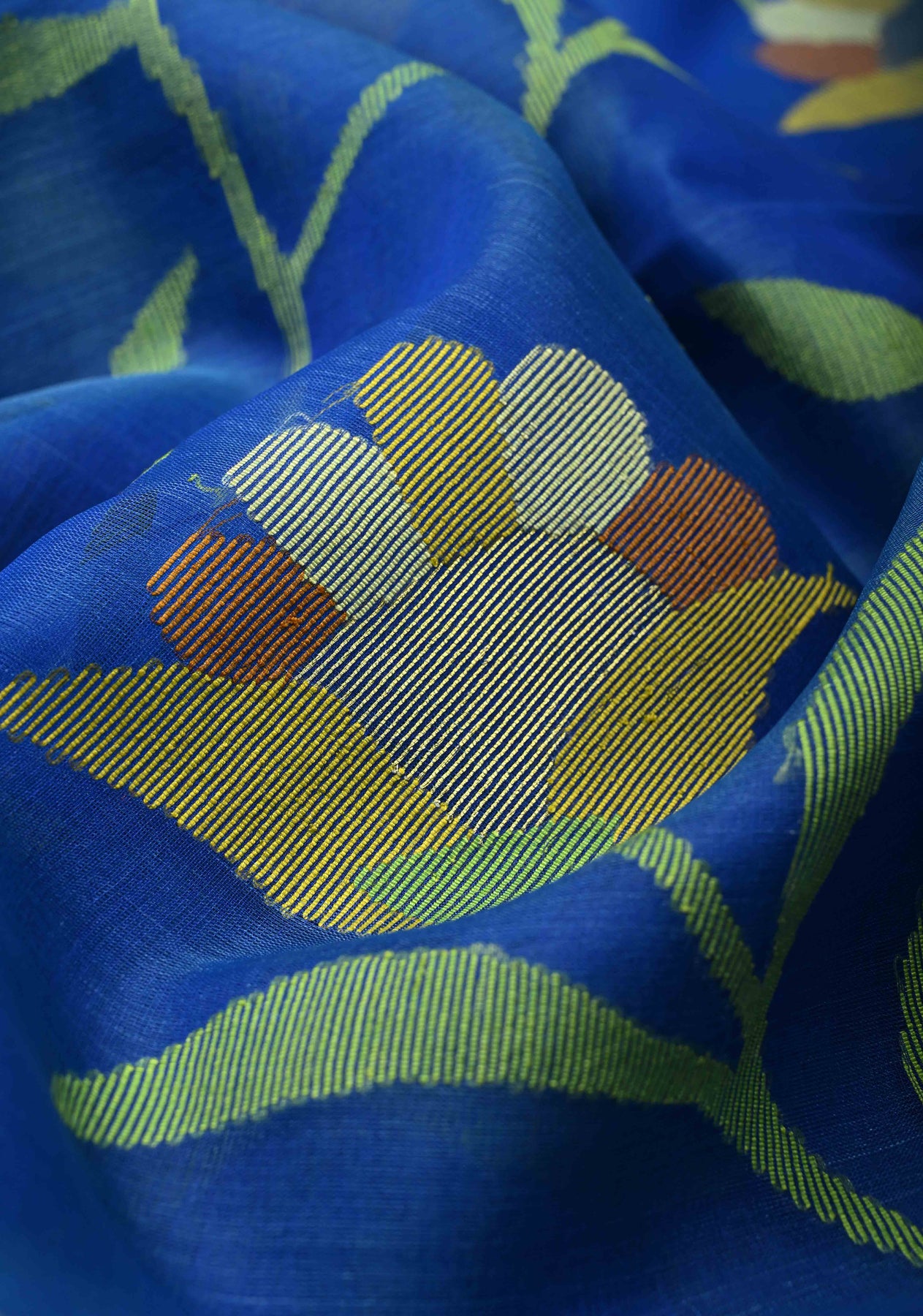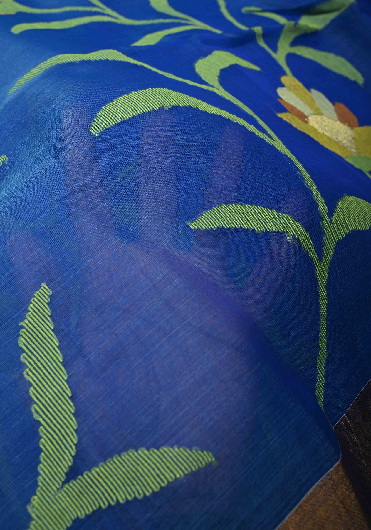 Elevate your festive wardrobe with this Sapphire Blue Silk Muslin Saree, adorned with exquisite Meenakari designs and intricate Resham Jamdani weaving. The rich sapphire blue fabric is enhanced by a zari border-pallu, adding a regal touch to its elegant drape. Crafted from lightweight silk muslin, this saree perfectly blends traditional craftsmanship with contemporary sophistication, making it ideal for weddings, festivals, and special occasions. Pair it with statement gold or kundan jewelry for a majestic finish.