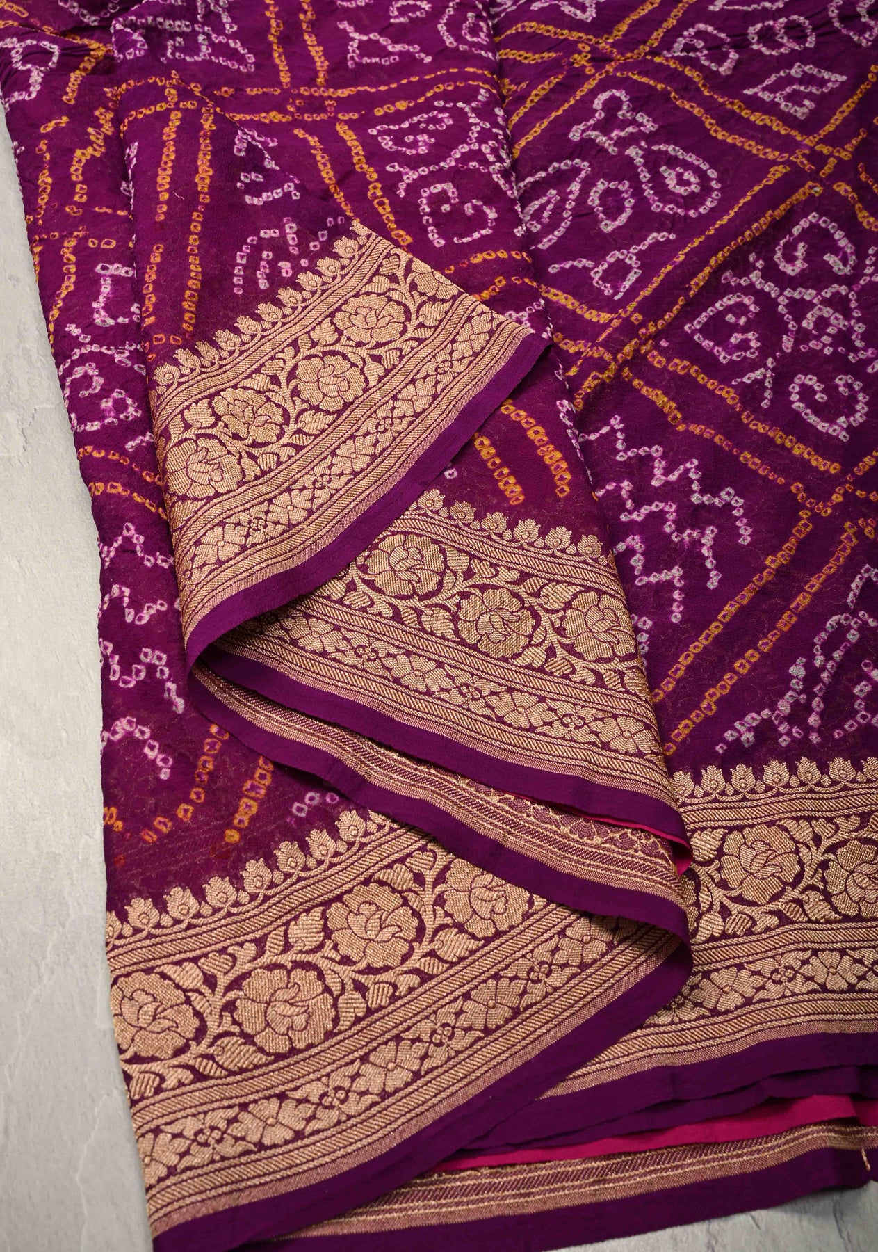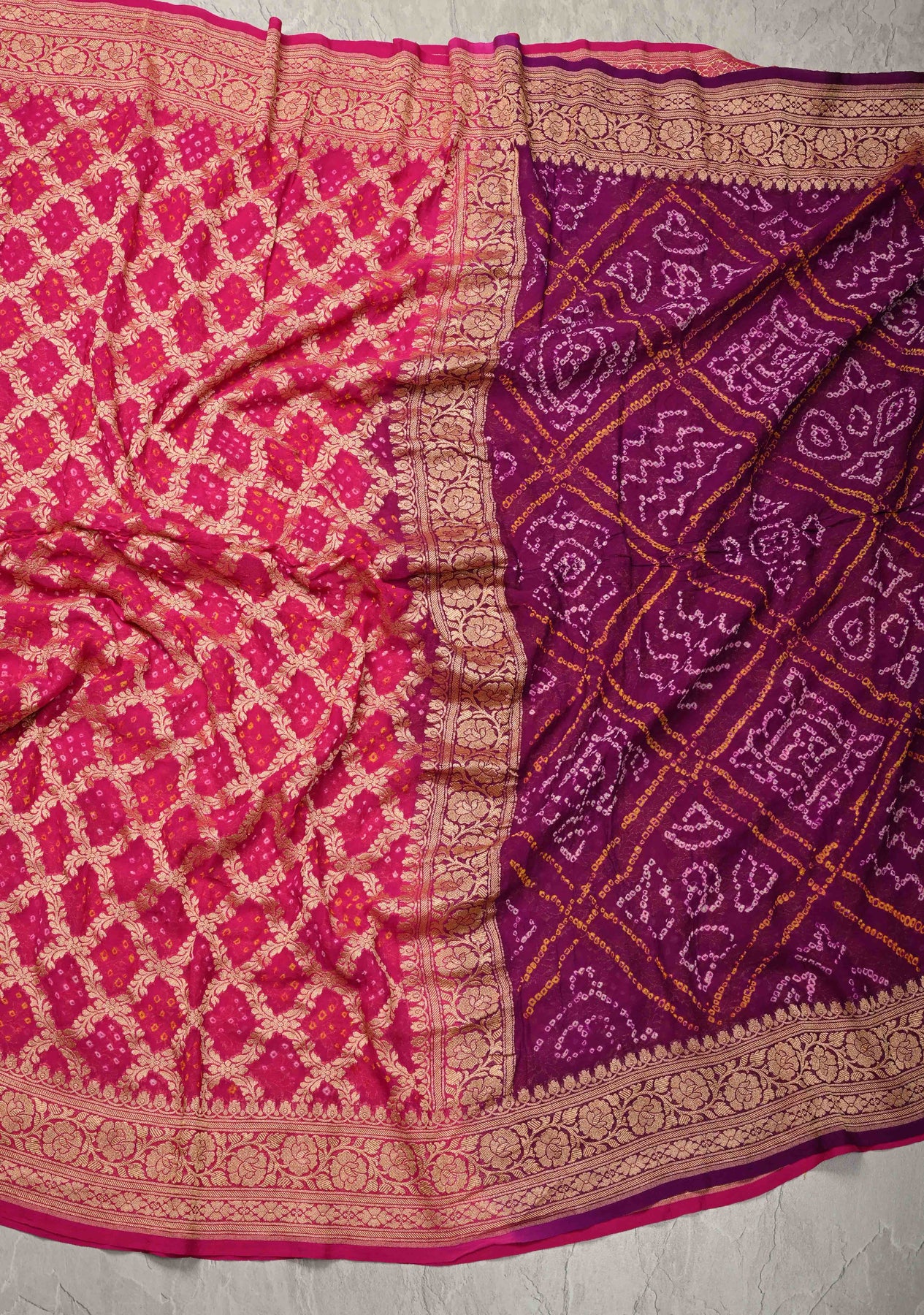 Sarkam Bandhni and Jaal Banarasi Half and Half Pattern pure Silk Georgette Saree in Purple and Pink | SILK MARK CERTIFIED