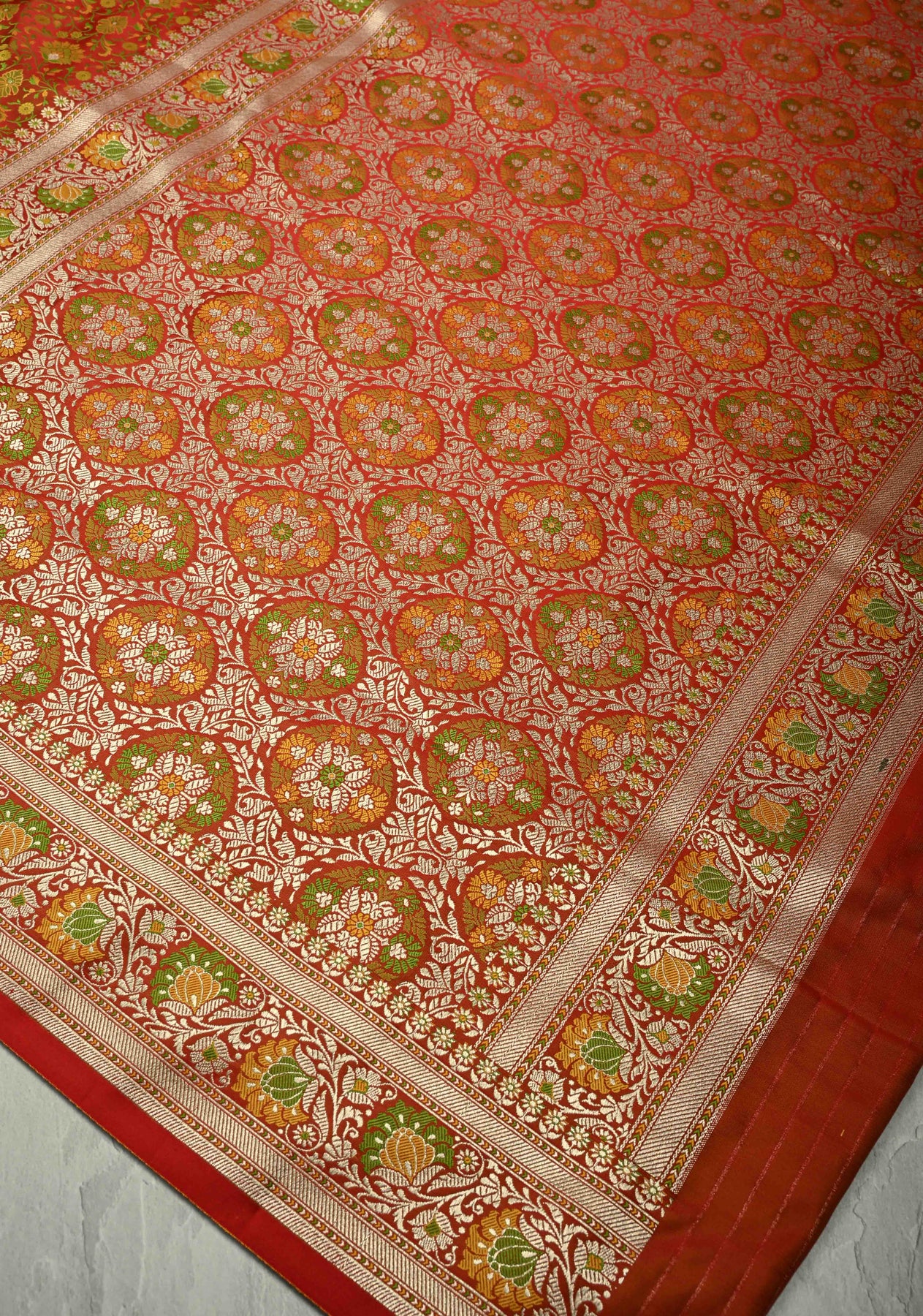 Scarlet Red Semi Tanchoi Banarasi Satin Silk Saree with Meenakari Floral Brocade Jaal