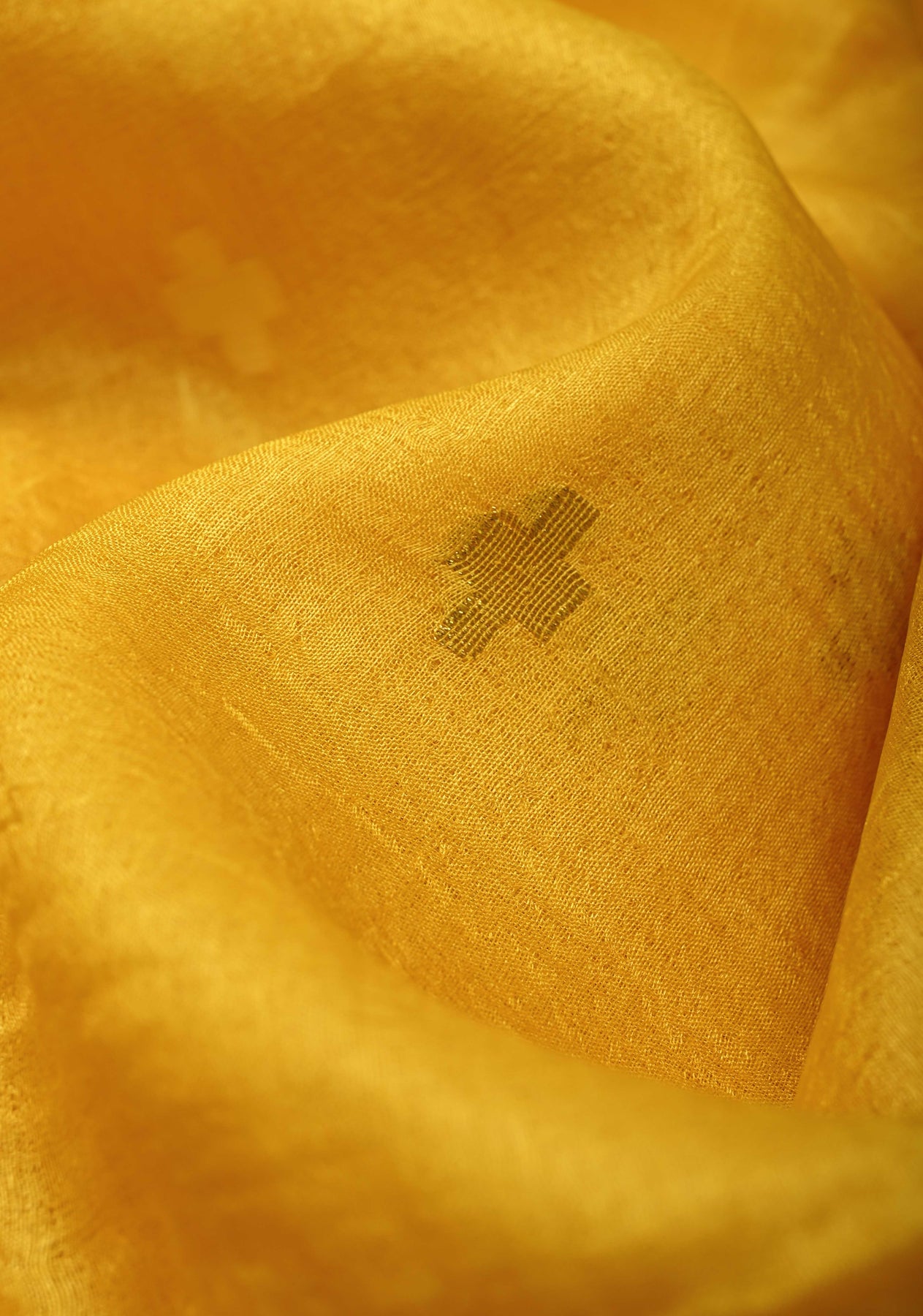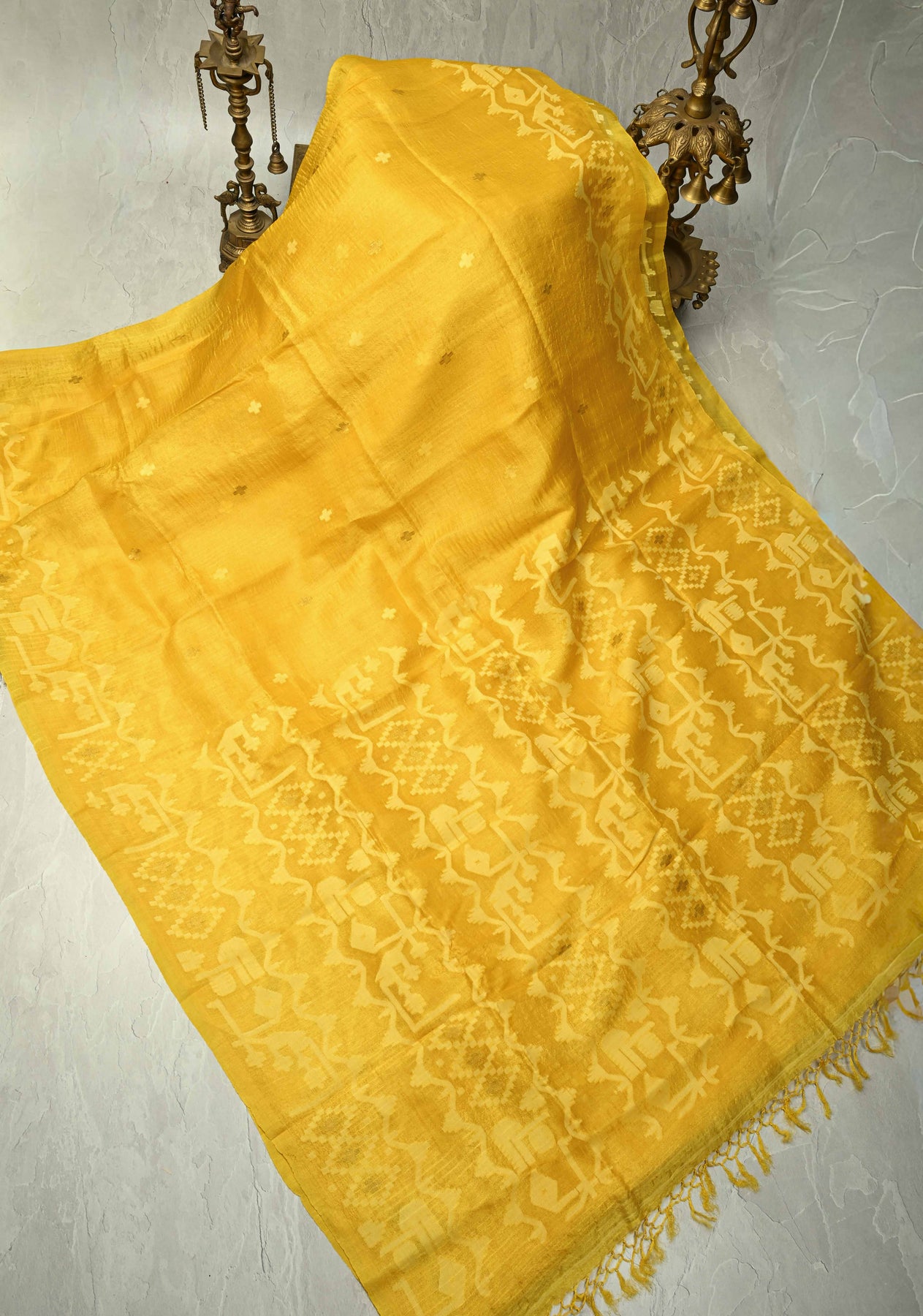 Brighten your ethnic wardrobe with this Sunflower Yellow Tussar Silk Saree, adorned with intricate Resham and Zari detailing that enhances its traditional charm. Handwoven from premium Tussar silk, the saree offers a soft, textured drape with a natural sheen, perfect for both comfort and elegance.