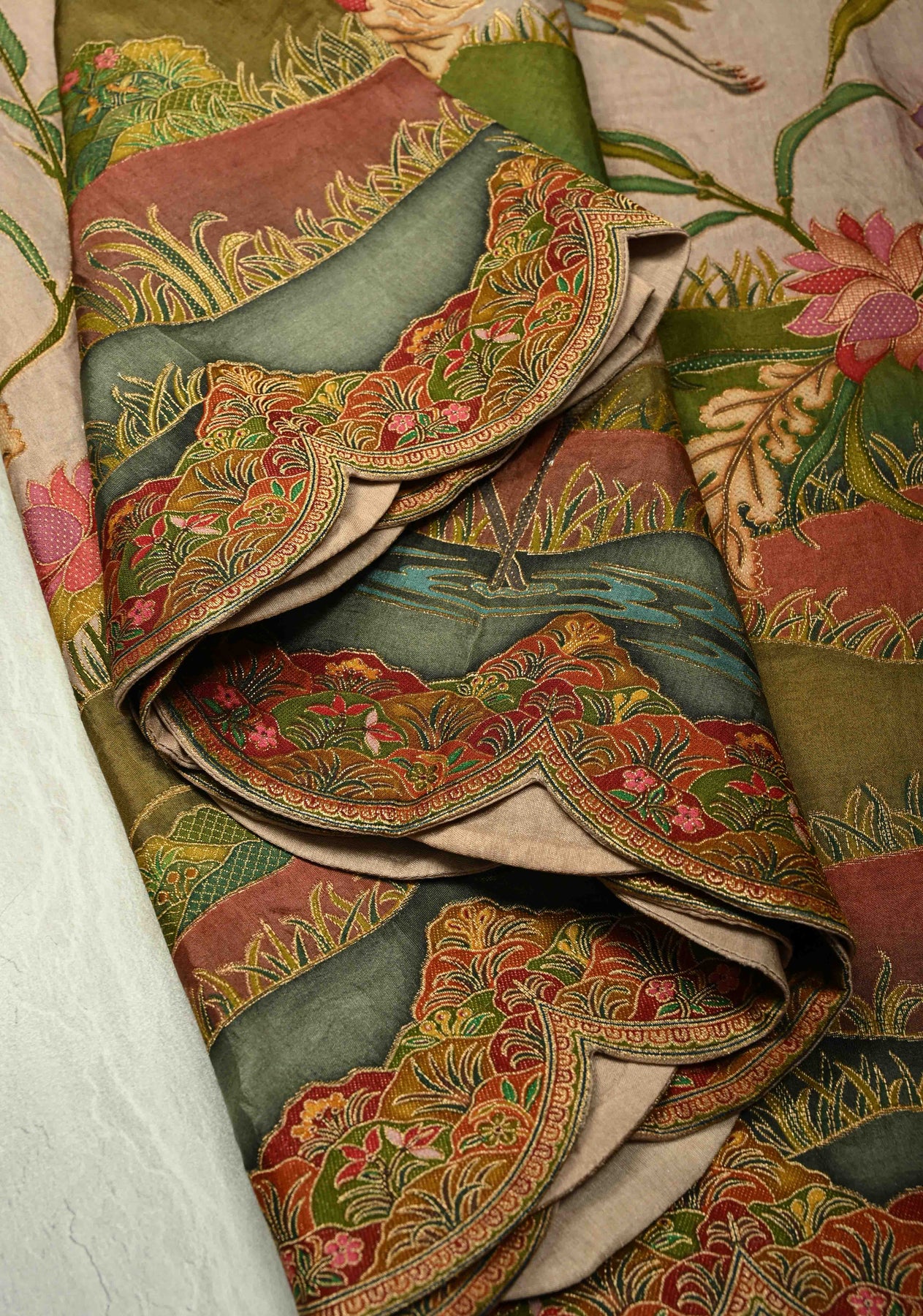 Flower blossoms with delicate crane and floral ecosystem motifs, beautifully detailed against a light Light Brown base. The design celebrates nature’s grace and balance, combining ethical elegance with artistic charm.