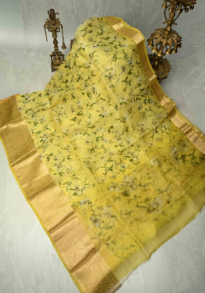 Canary Yellow Pure Organza Silk Saree with Floral Print and Zari Border | SILK MARK CERTIFIED