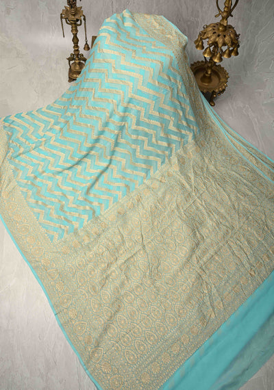 Aqua Blue Banarasi Georgette Silk Saree with Chevron Patterns and Zari Border | SILK MARK CERTIFIED