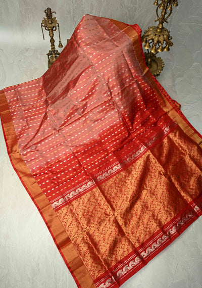 Scarlet Red Meenakari Buttas on Uppada Handloom Silk Saree with Panel and Muted Tissue Zari Border| SILK MARK CERTIFIED