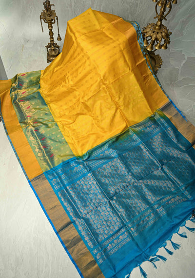 Mustard Yellow Sona Rupa Buttas-Stripes on Uppada Handloom Silk Saree with Panel and Muted Tissue Zari Border| SILK MARK CERTIFIED