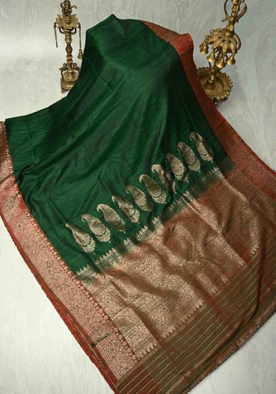 Pure Banarasi Dupion Silk Saree in Forest Green with Antique Zari Paisley Buttas and Zari Border | SILK MARK CERTIFIED