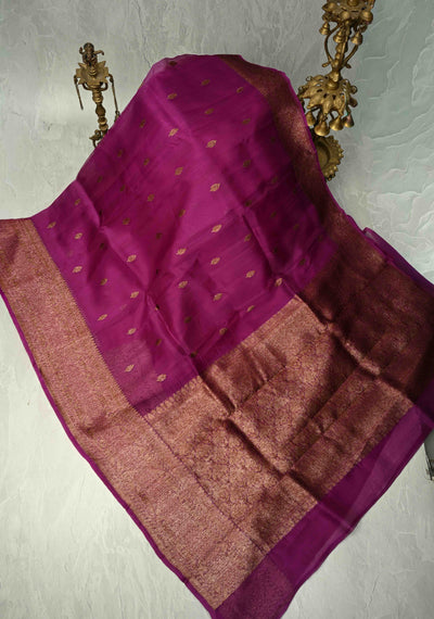 Magenta Pure Banarasi Kora Silk Saree with Antique Zari Buttas and Zari Border | SILK MARK CERTIFIED