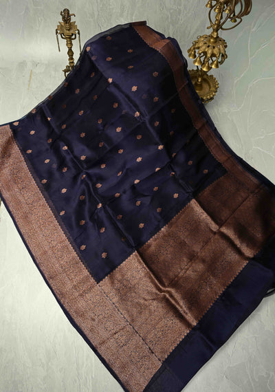 Navy Blue Organza Silk Saree with Antique Floral Buttas and Zari Border | SILK MARK CERTIFIED