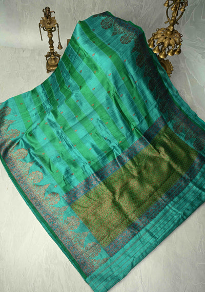Green-Blue Horizontal Stripes on Banarasi Raw Silk Hand Brush Dye Saree with Antique Zari Buttis and Zari Border | SILK MARK CERTIFIED