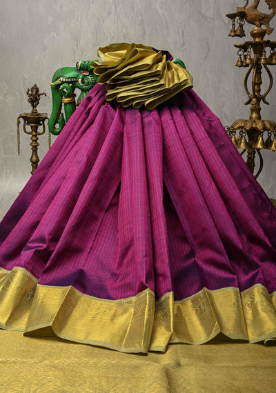 Purplish Pink Pin Zari Stripes on Kanjivaram Soft Silk Saree with Zari Buttas and Contrast Border | SILK MARK CERTIFIED