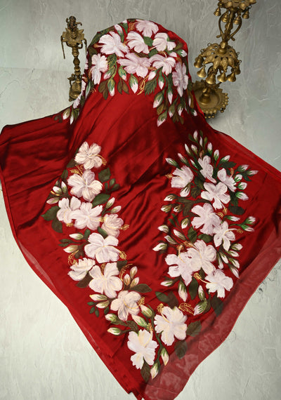 Deep Red Chiffon Saree with Floral Handpainted ,No Blouse Piece