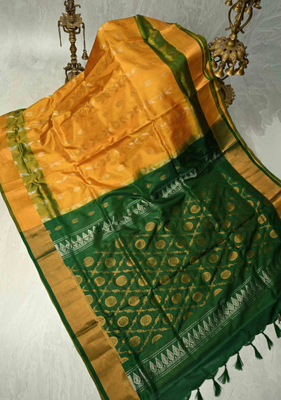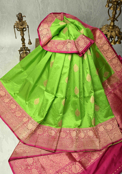 Chartreuse Katan Silk Handloom Saree with Zari Buttas and Contrast Zari Border | SILK MARK CERTIFIED