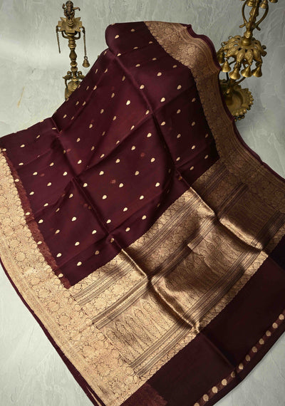 Stunning Garnet Pure Banarasi Organza Silk Saree with Zari Buttas and Zari Border | SILK MARK CERTIFIED