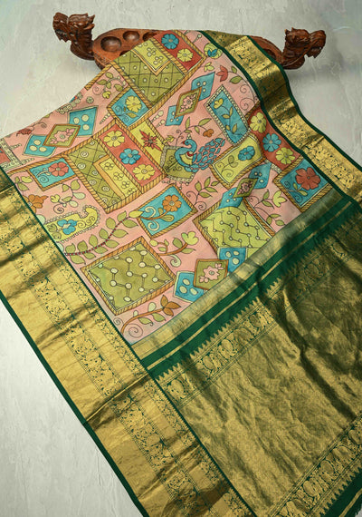 Peacock-Floral Theme : Authentic Pen Kalamkari on Pure Kanjivaram Silk Saree with Zari Border | SILK MARK CERTIFIED