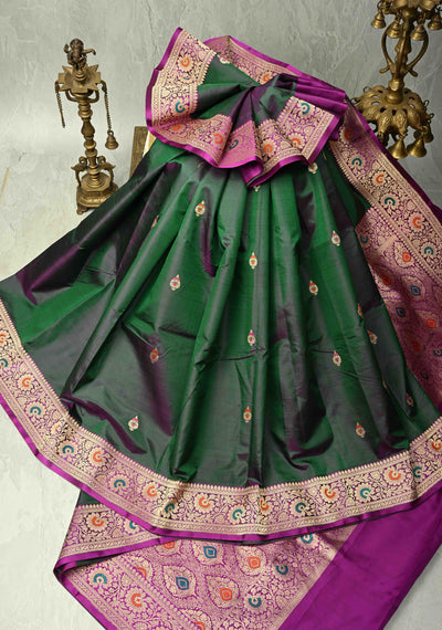 Green Dual tone Banarasi Katan Silk Saree with Meenakari Buttas and Contrast Zari Border | SILK MARK CERTIFIED