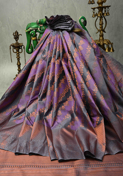 Gray- Dark Lavender Pure Kanjivaram Silk Saree with Rangkaat Style and Copper Zari Border | SILK MARK CERTIFIED