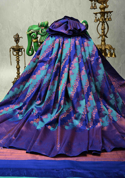 Blue-Turquoise Pure Kanjivaram Silk Saree with Rangkaat Style and Copper Zari Border | SILK MARK CERTIFIED
