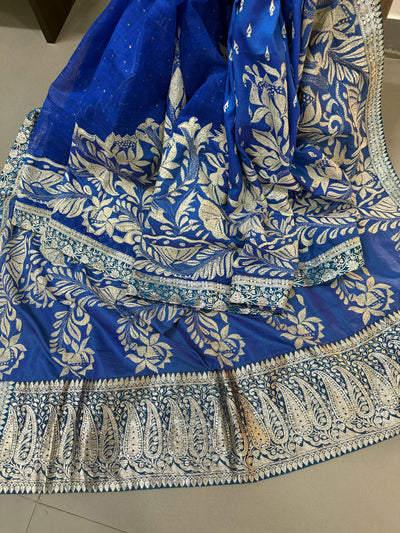 Blue Dual tone Kantha Hand Embroidery on Pure Silk Saree with Banarasi Brocade Border and Patli Pallu| SILK MARK CERTIFIED