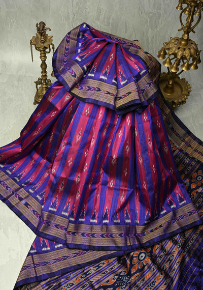 Ink Purple-Magenta Handloom Sambalpuri Ikkat Silk Saree with Stripes Design and Border, No Blouse Piece | SILK MARK CERTIFIED