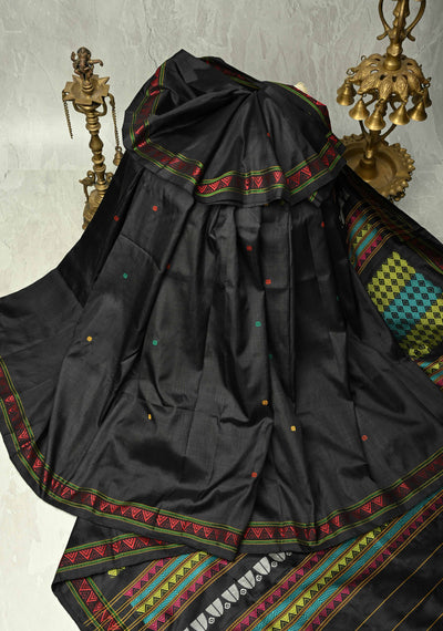 Black Handloom Sambalpuri Ikkat Silk Saree with Meenakari Resham Chunri Buttis and Border-Pallu, No Blouse Piece | SILK MARK CERTIFIED