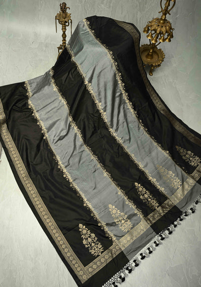 Black-Gray Banarasi Katan Silk Saree with Vine Zari Stripes and Zari Border | SILK MARK CERTIFIED