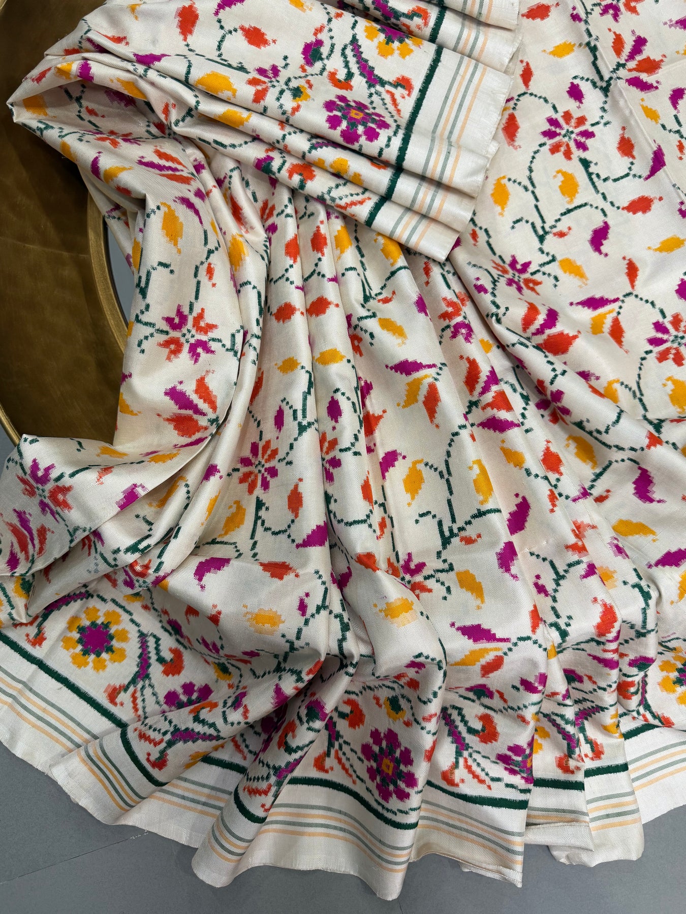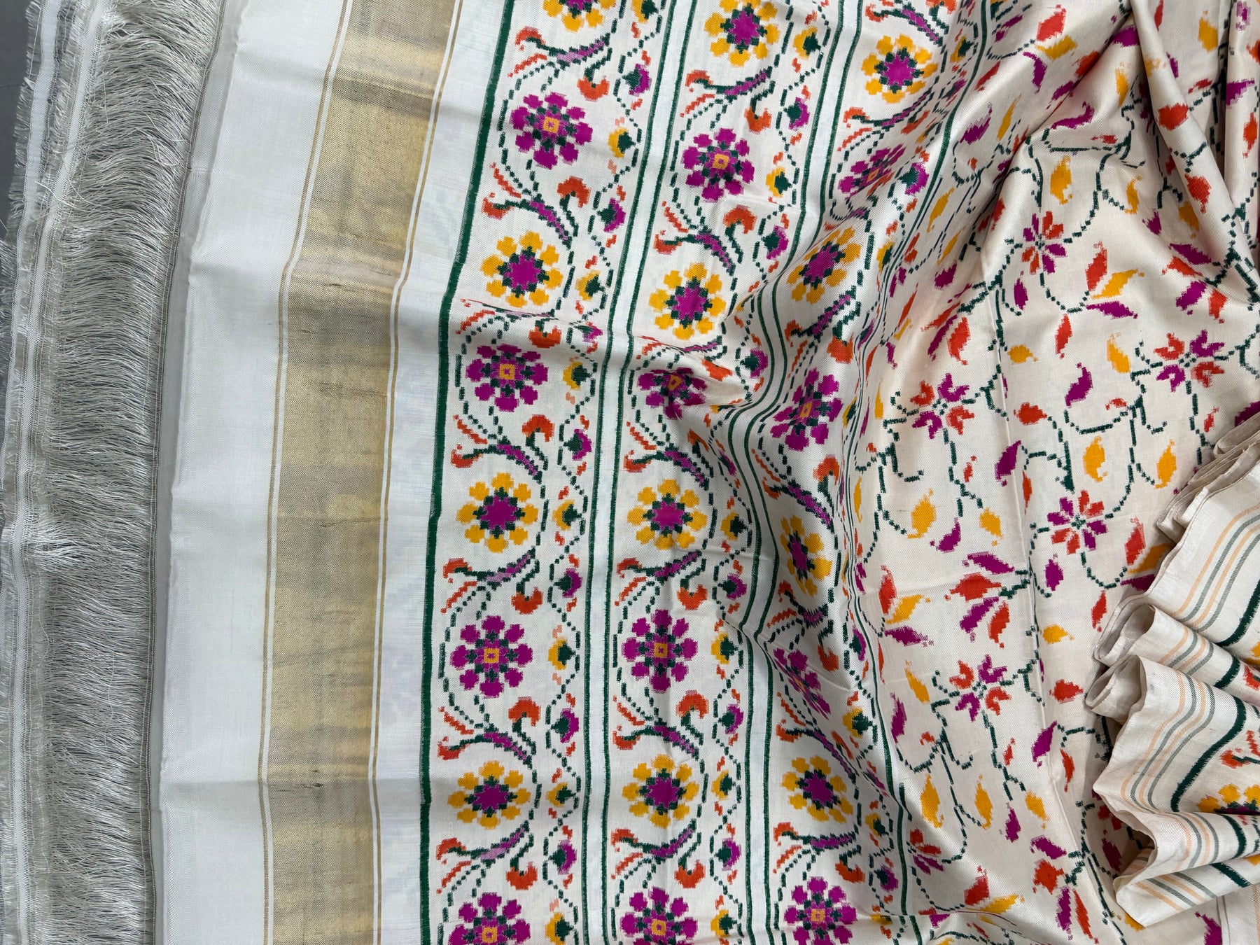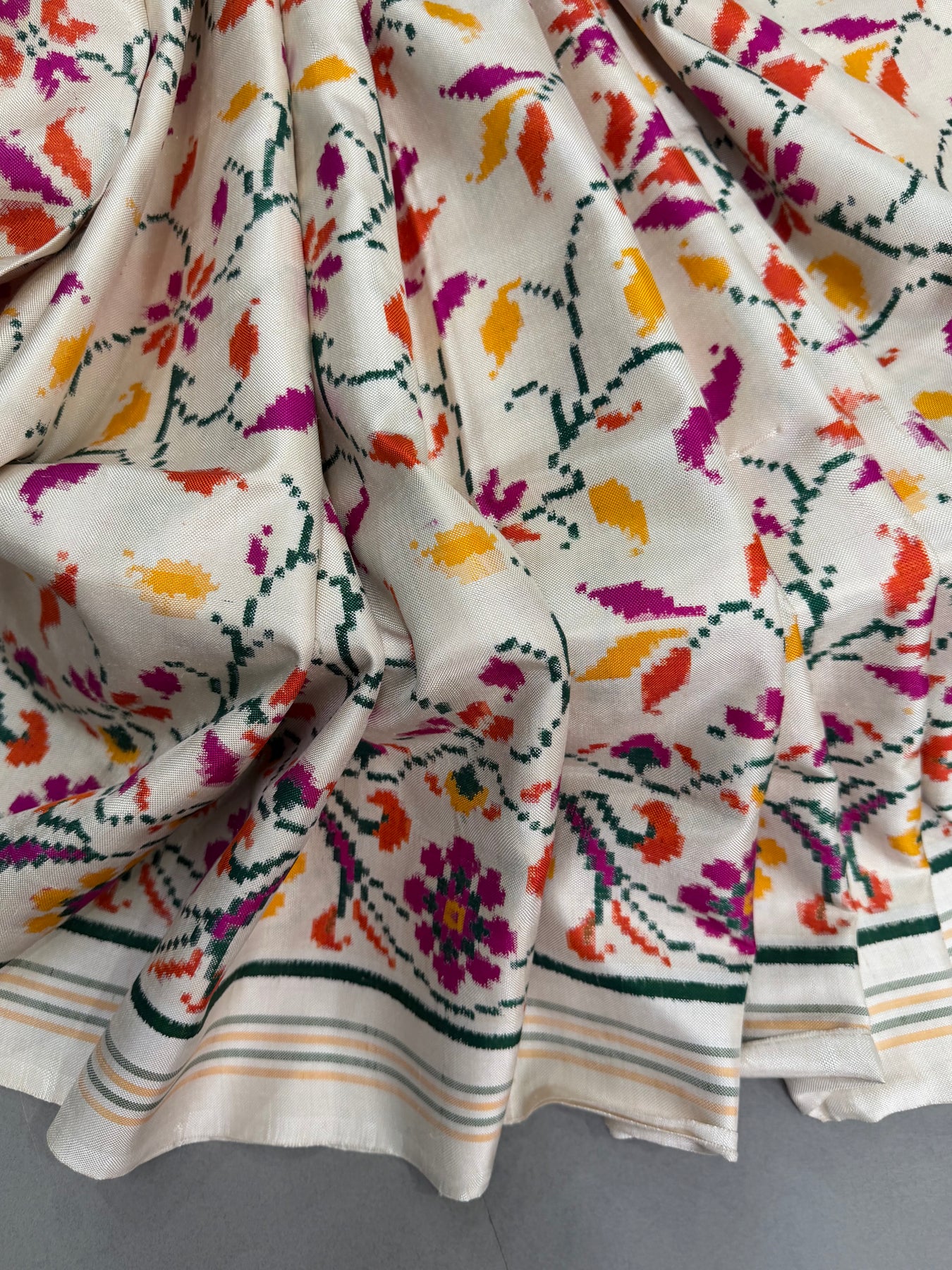Ivory Authentic Patan Patola Double Ikkat Pure Silk Saree With Floral Brocade Jaal and Pallu on Both Side | SILK MARK CERTIFIED