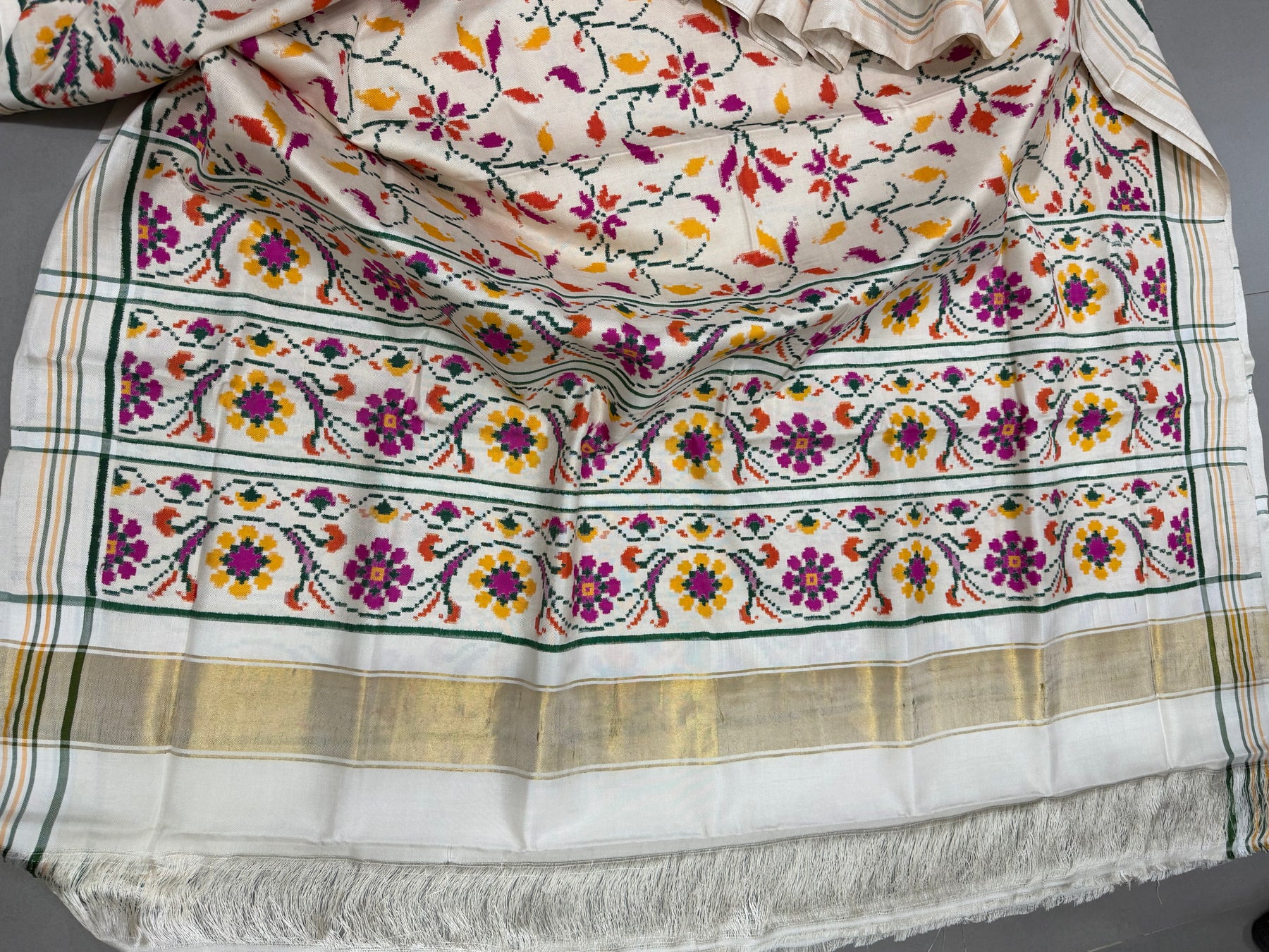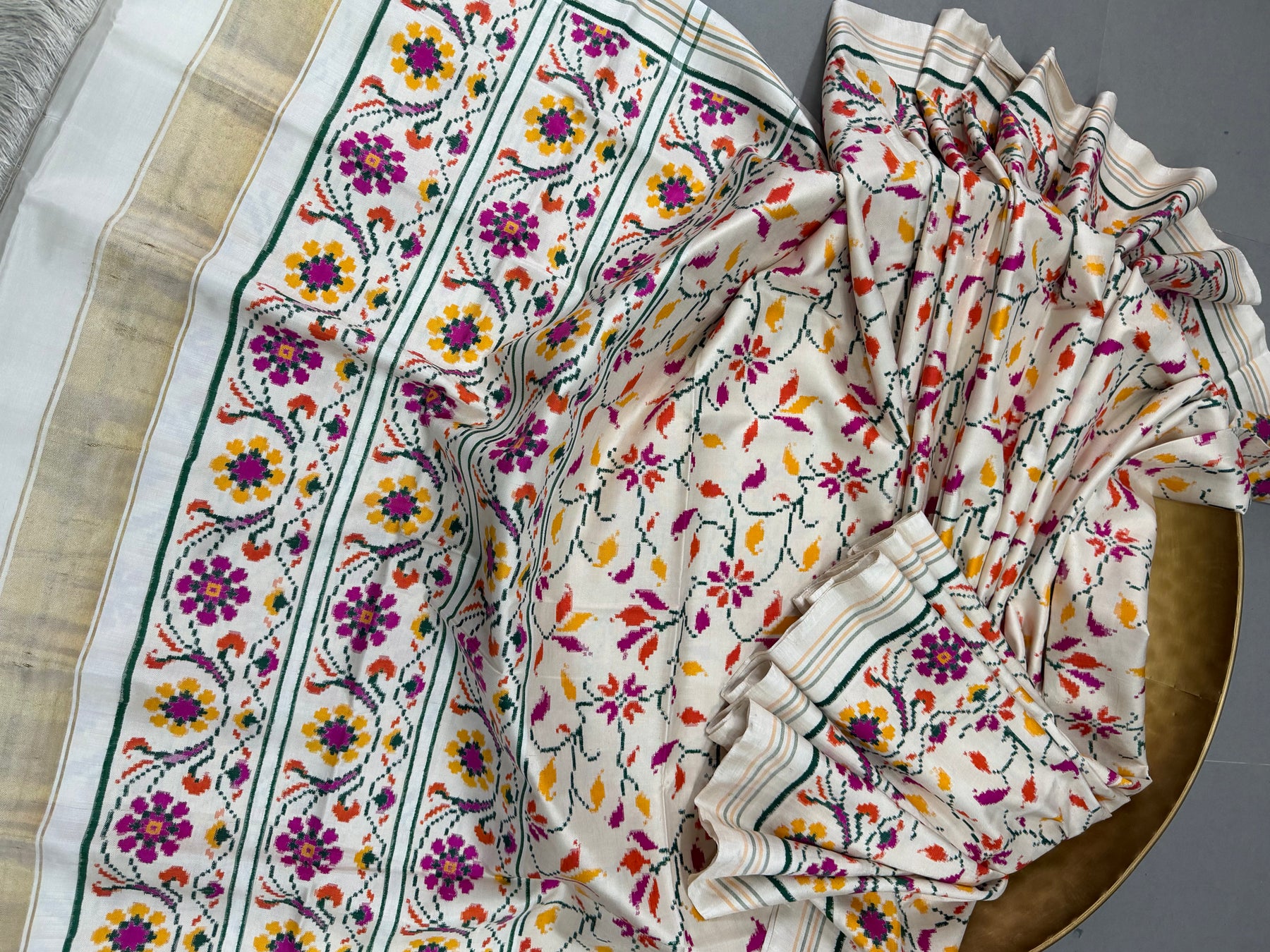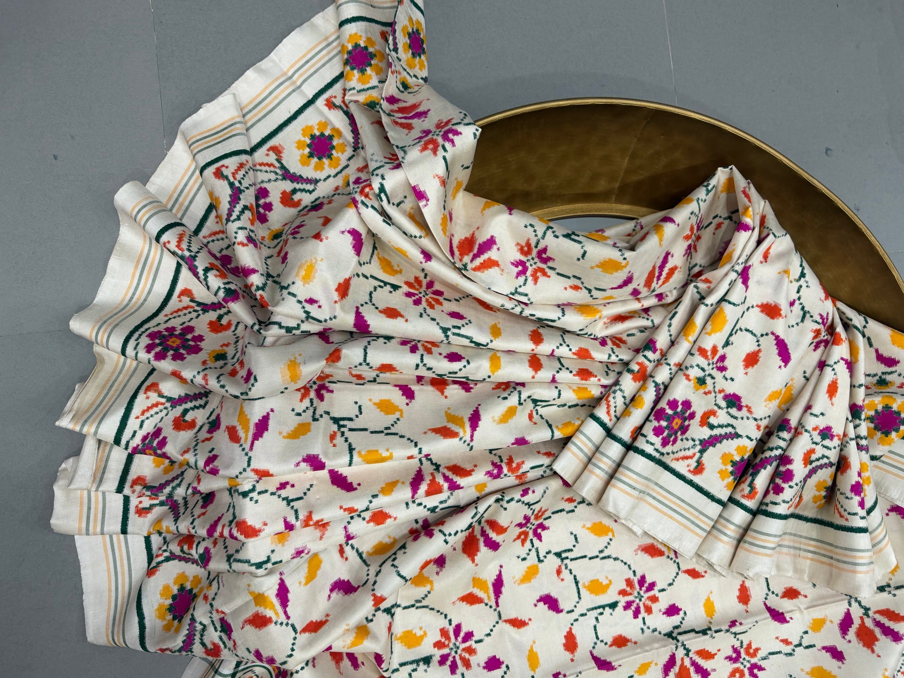 Ivory Authentic Patan Patola Double Ikkat Pure Silk Saree With Floral Brocade Jaal and Pallu on Both Side | SILK MARK CERTIFIED