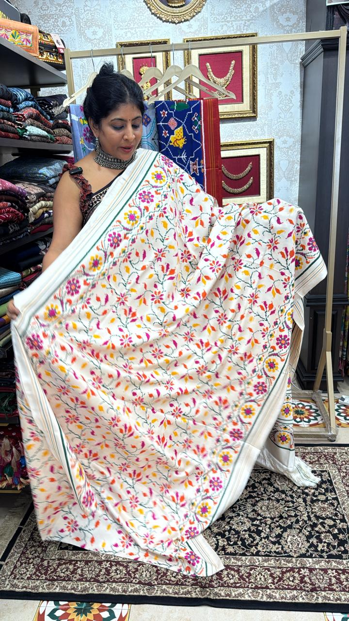 Ivory  Authentic Patan Patola Double Ikkat Pure Silk Saree With Floral Brocade Jaal and Pallu on Both Side | SILK MARK CERTIFIED