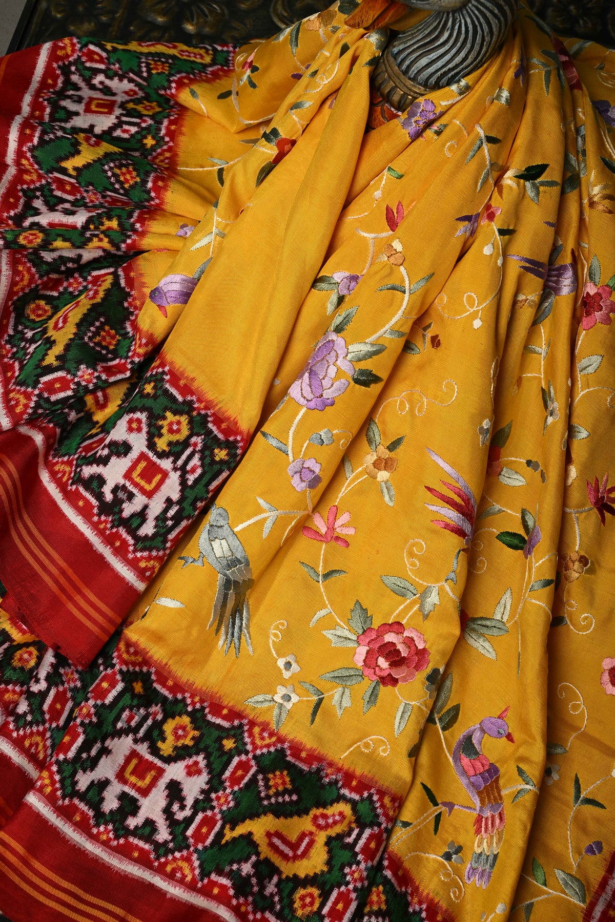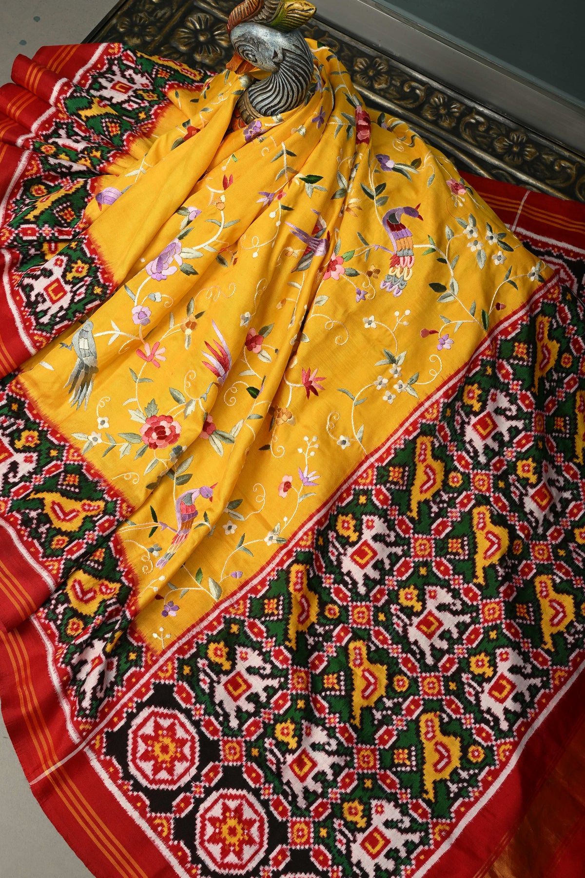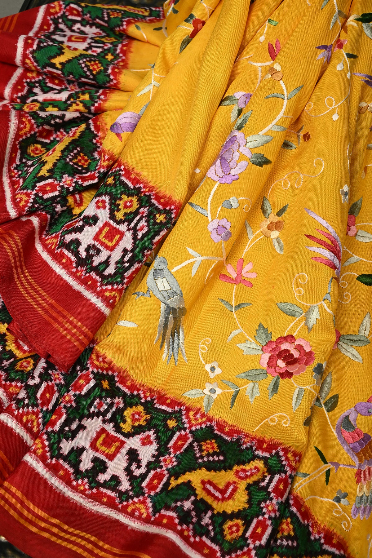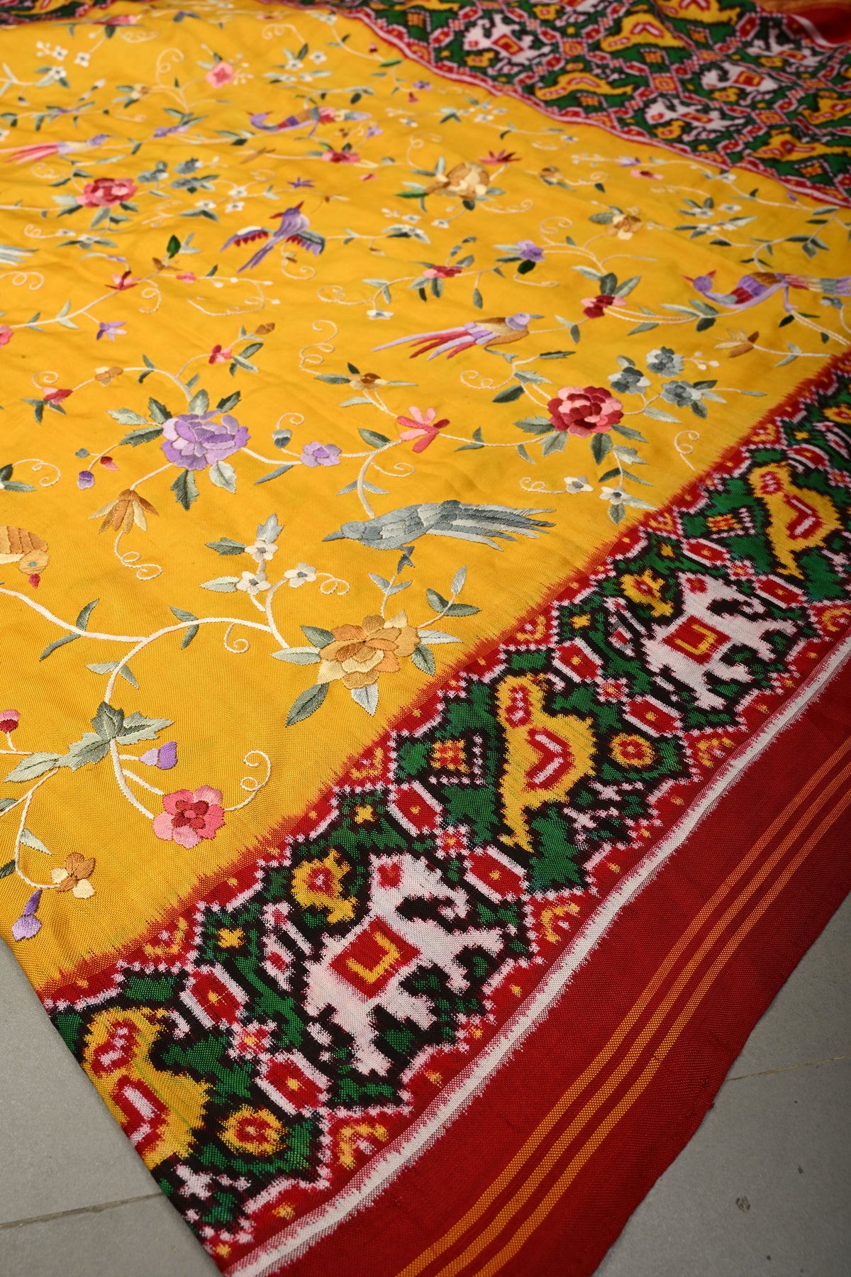 Draped in a mustard yellow hue, this exquisite saree is elevated with authentic Parsi Gara hand embroidery, featuring an elegant floral jaal with bird motifs that symbolize beauty, harmony, and freedom. This rare, and heirloom-worthy, this Patola saree is perfect for bridal trousseaus, grand celebrations, and collectors of fine textiles.