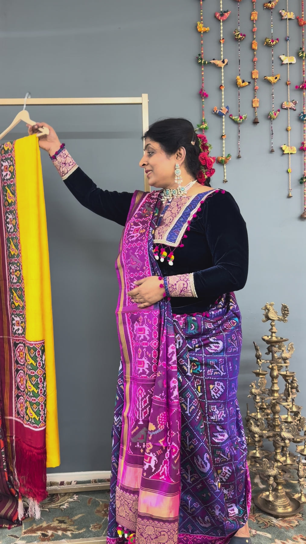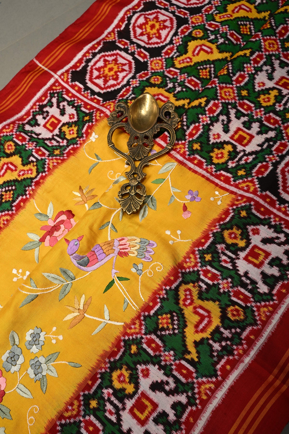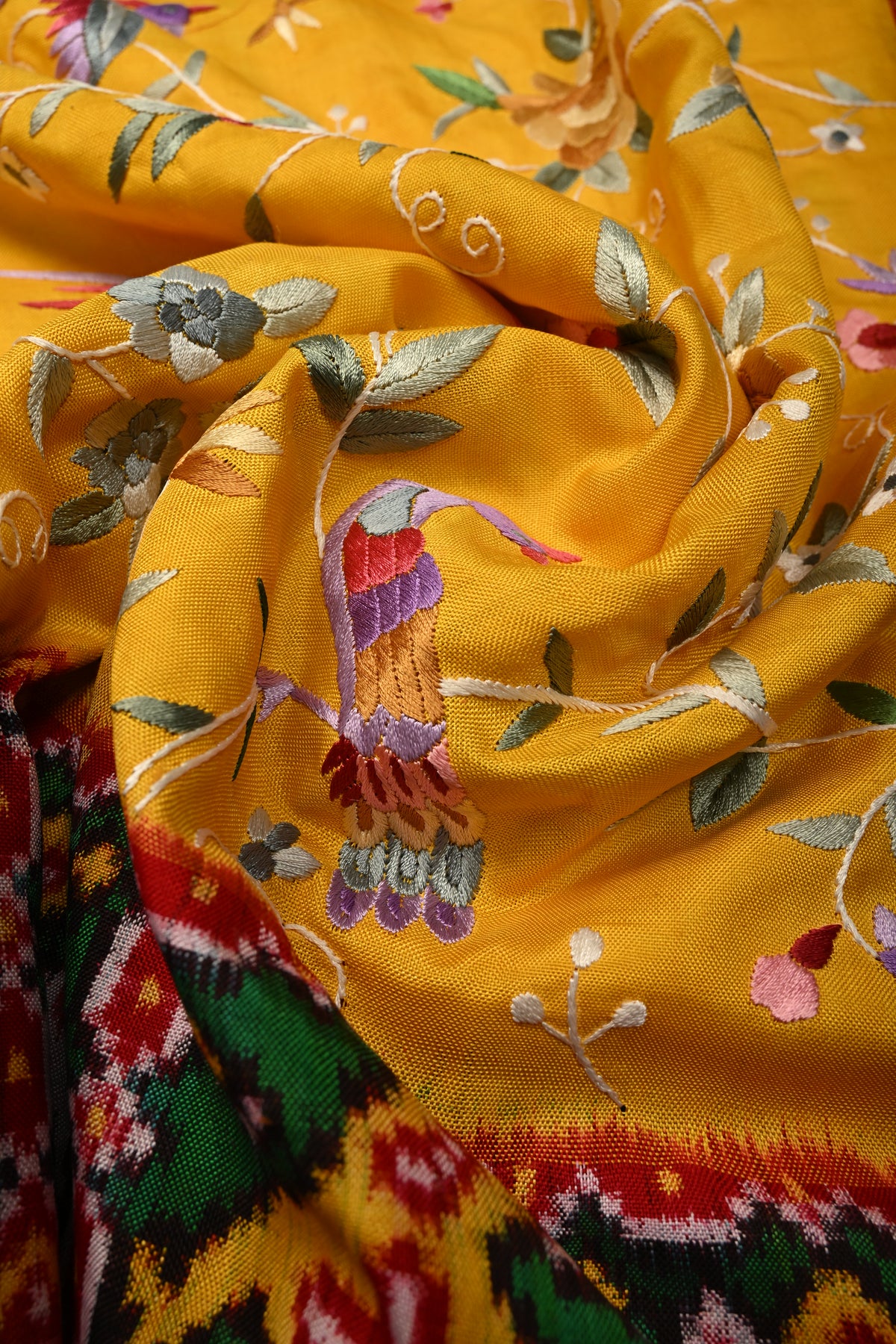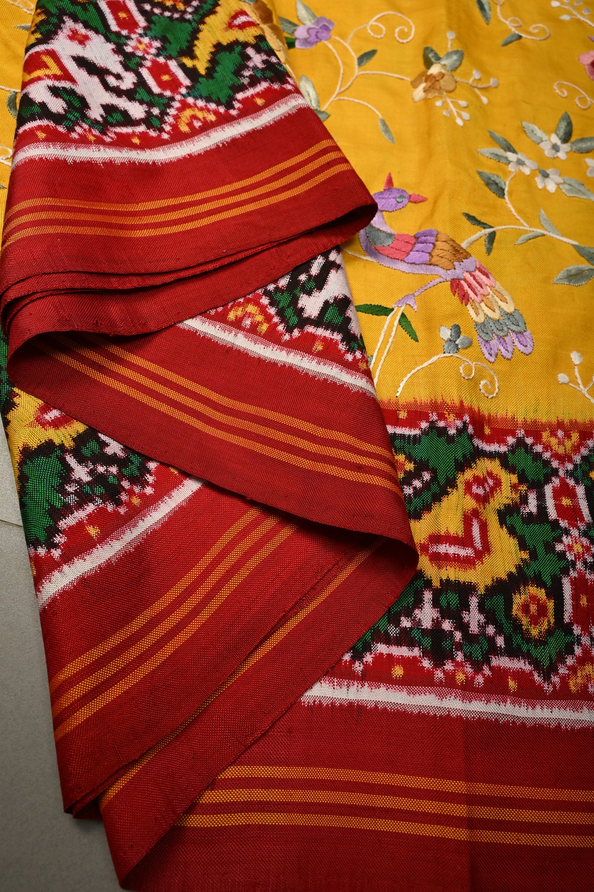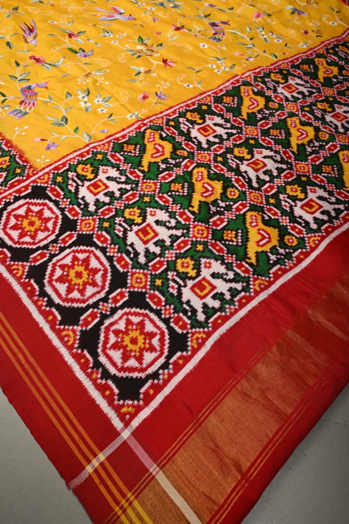 Draped in a mustard yellow hue, this exquisite saree is elevated with authentic Parsi Gara hand embroidery, featuring an elegant floral jaal with bird motifs that symbolize beauty, harmony, and freedom. This rare, and heirloom-worthy, this Patola saree is perfect for bridal trousseaus, grand celebrations, and collectors of fine textiles.