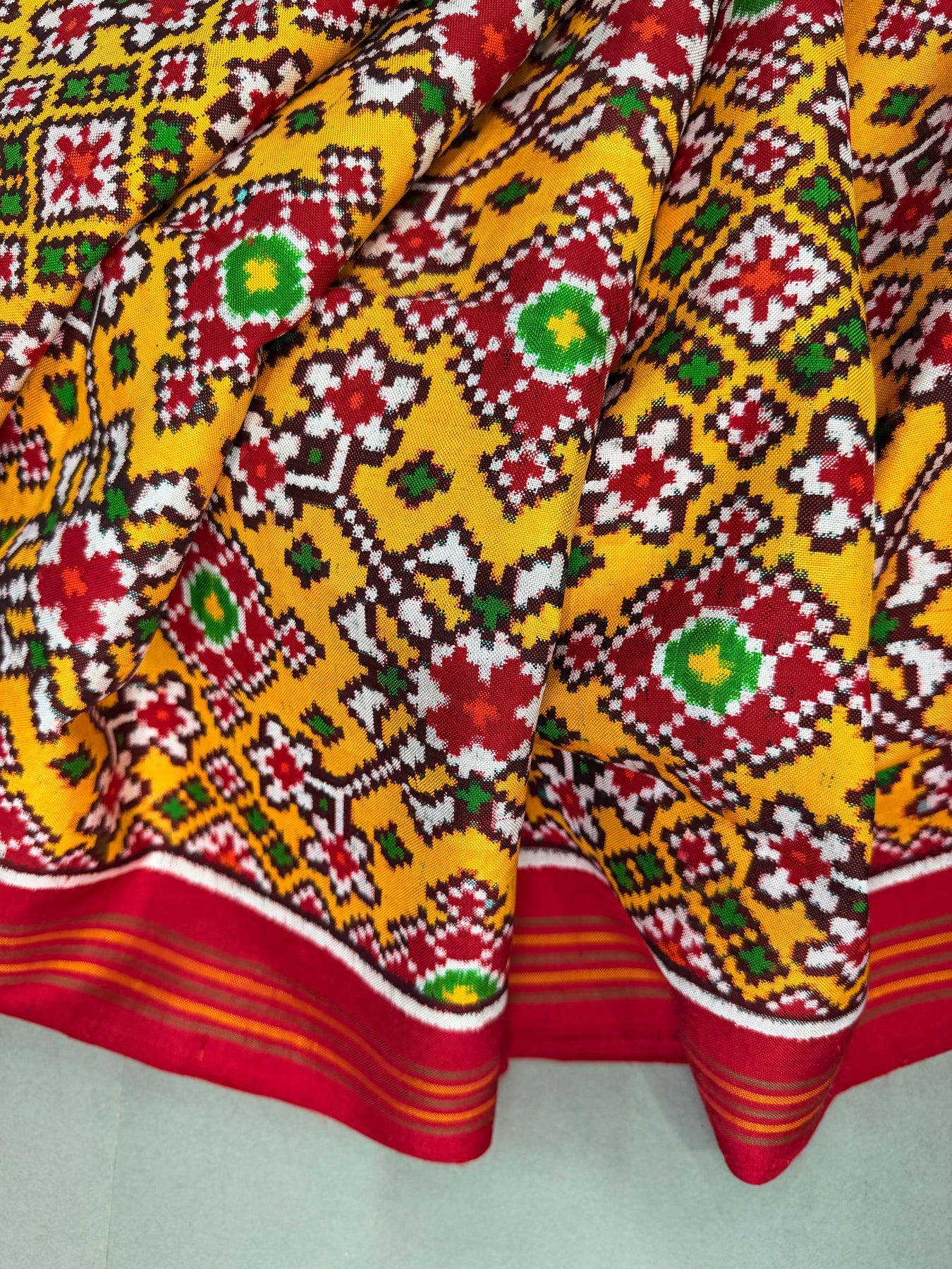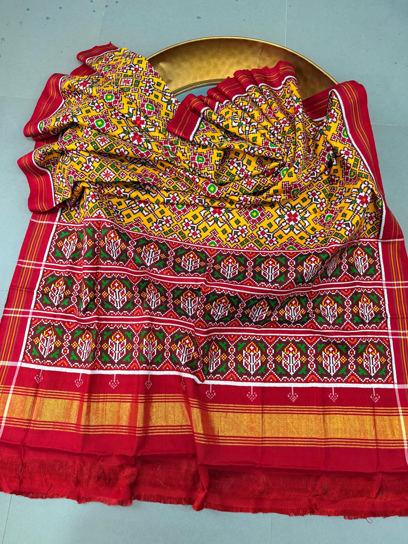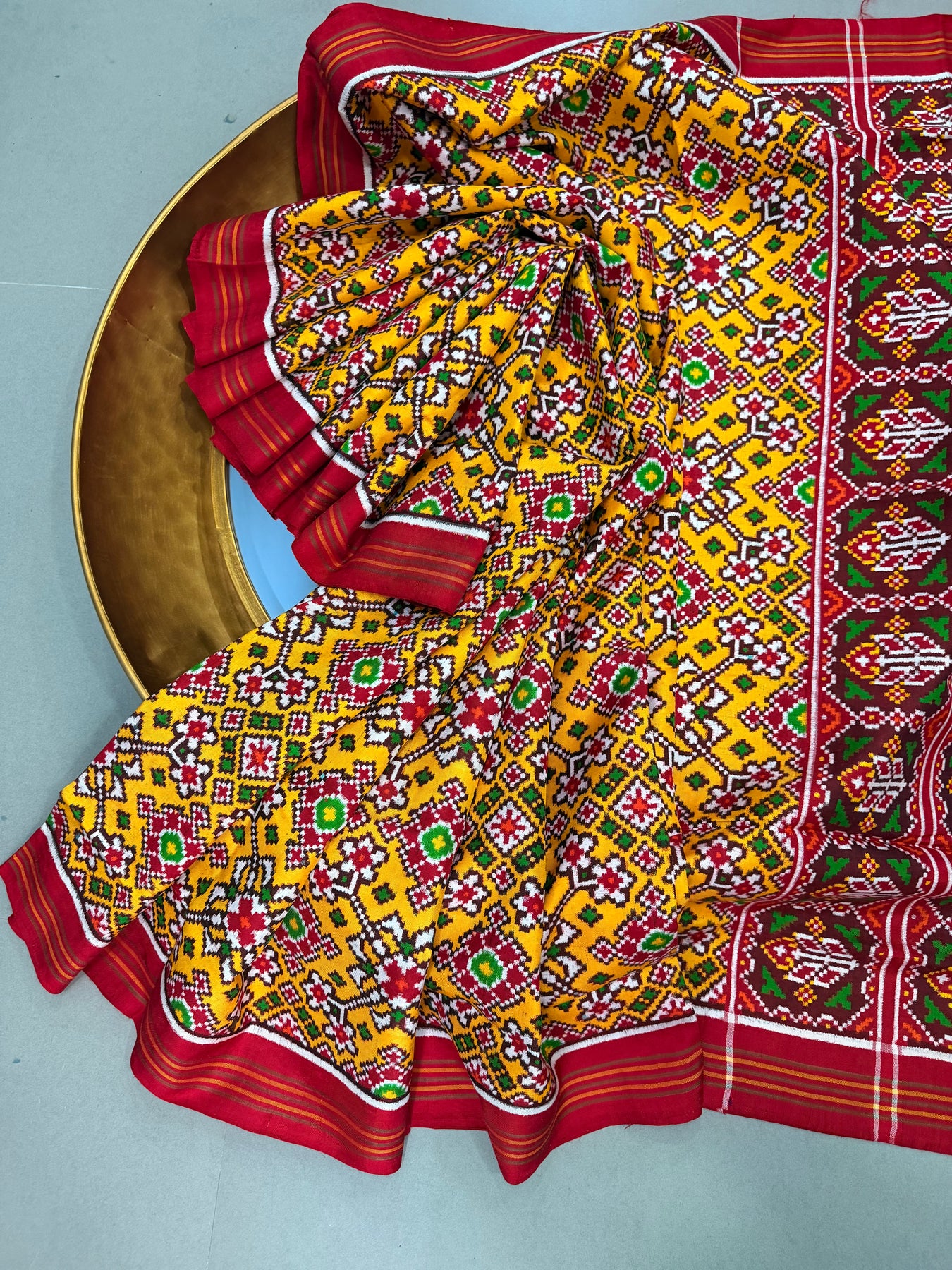 Radiate timeless elegance with this Yellow Reversible Authentic Patan Patola Double Ikkat Pure Silk Saree, a magnificent expression of India’s weaving heritage. Handwoven by master artisans of Patan using the intricate Double Ikkat technique, both warp and weft threads are carefully resist-dyed before weaving, achieving exceptional precision and symmetry. Crafted from pure silk, this saree features a striking geometric brocade across the body, beautifully contrasted with a bold red pallu woven on both sides, making it fully reversible. The vibrant yellow hue symbolizes prosperity and celebration, making this heirloom saree an ideal choice for weddings, festive occasions, and grand ceremonial events.