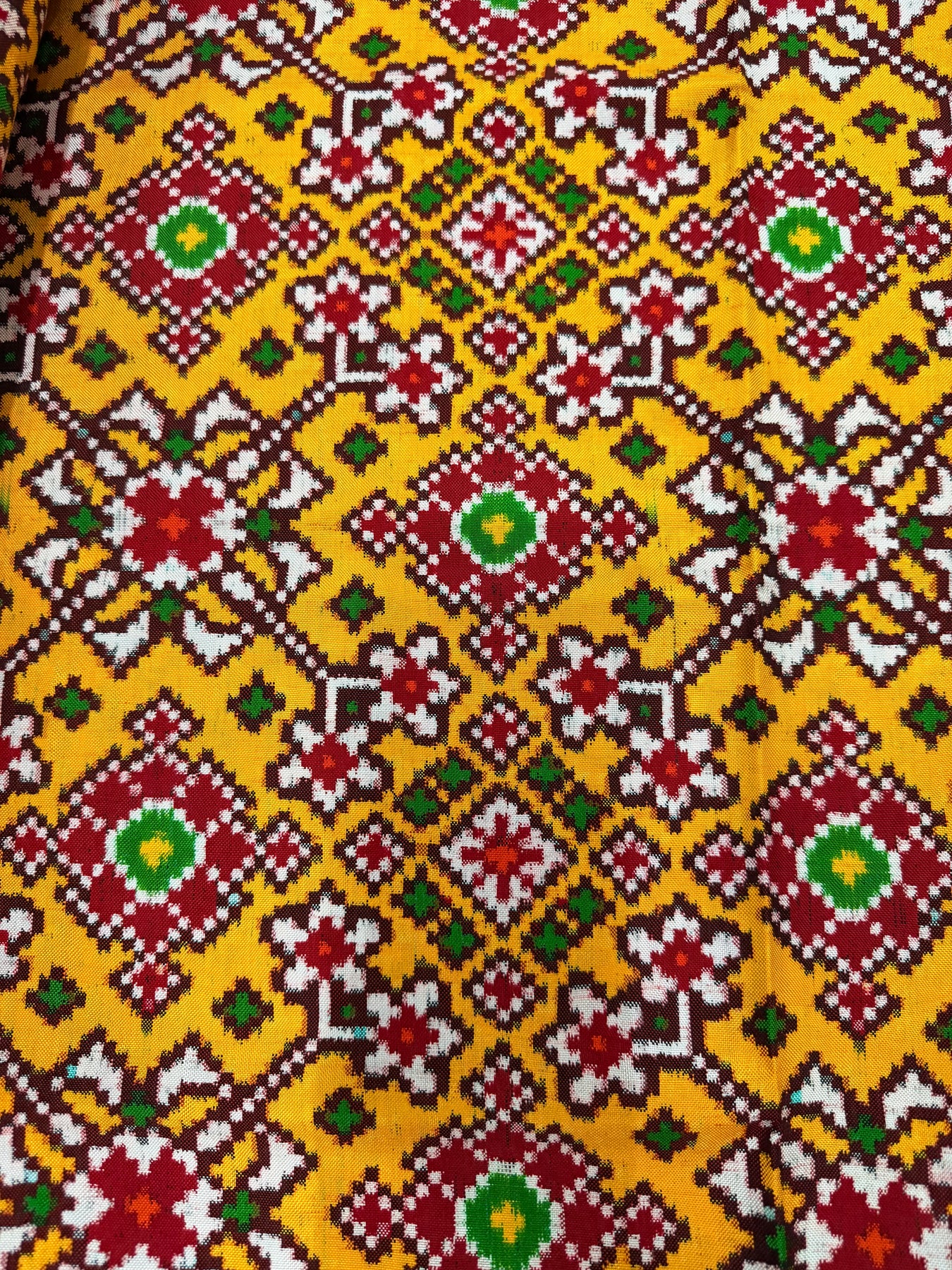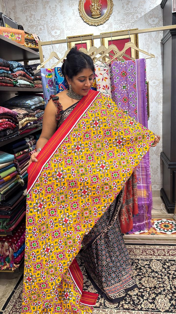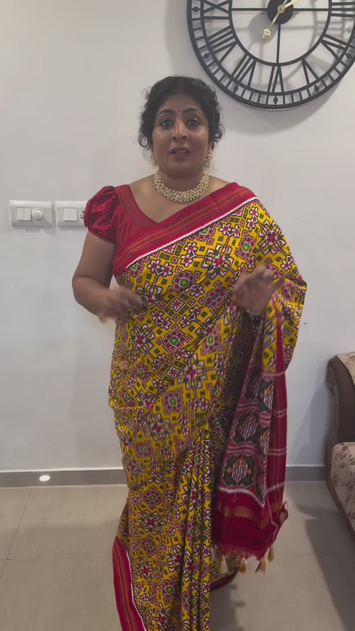 Radiate timeless elegance with this Yellow Reversible Authentic Patan Patola Double Ikkat Pure Silk Saree, a magnificent expression of India’s weaving heritage. Handwoven by master artisans of Patan using the intricate Double Ikkat technique, both warp and weft threads are carefully resist-dyed before weaving, achieving exceptional precision and symmetry. Crafted from pure silk, this saree features a striking geometric brocade across the body, beautifully contrasted with a bold red pallu woven on both sides, making it fully reversible. The vibrant yellow hue symbolizes prosperity and celebration, making this heirloom saree an ideal choice for weddings, festive occasions, and grand ceremonial events.