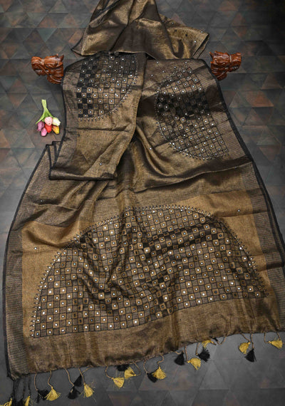 Copper and Black Cutwork and Mirror Work Tissue Linen Saree with dramatic tassels