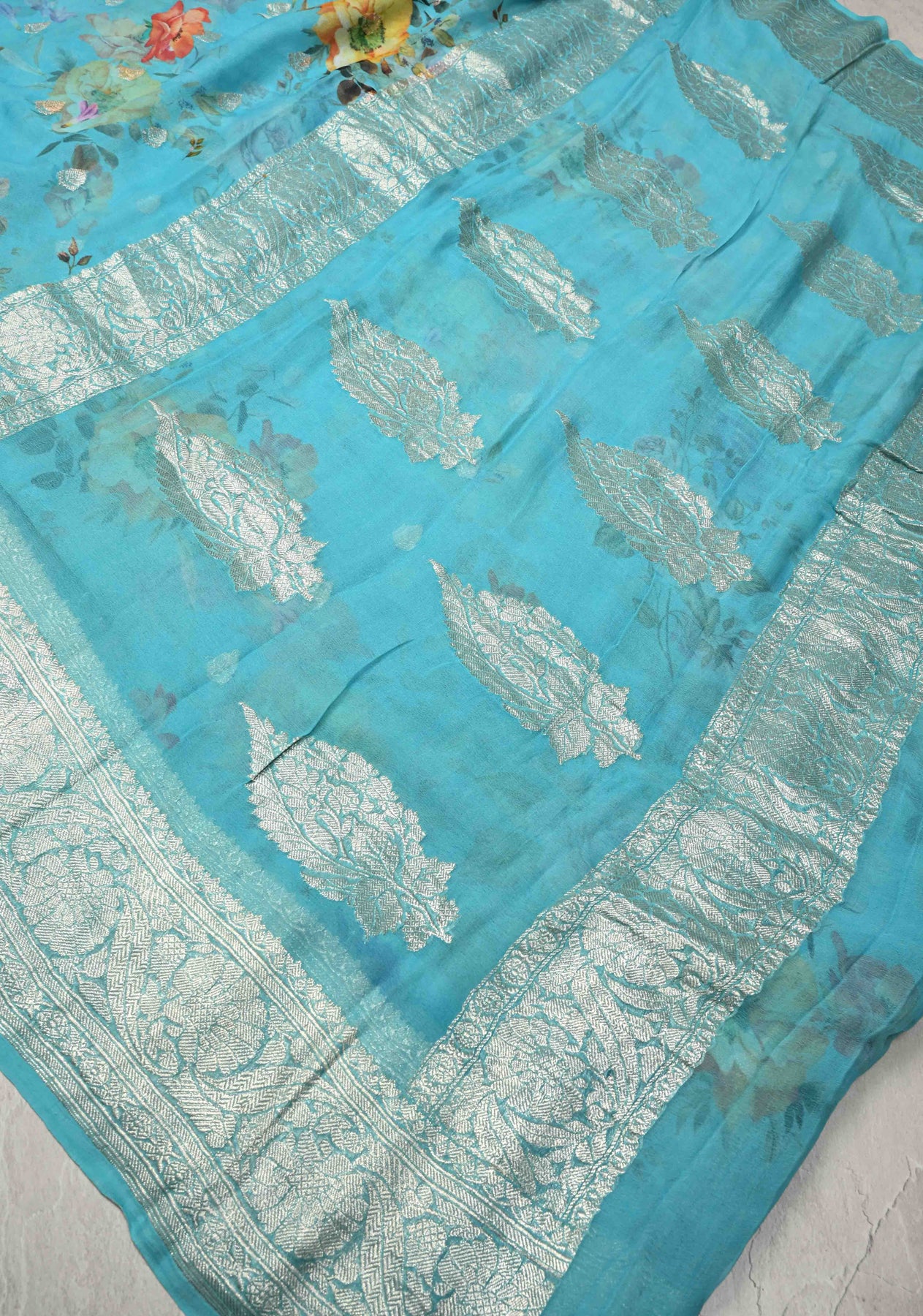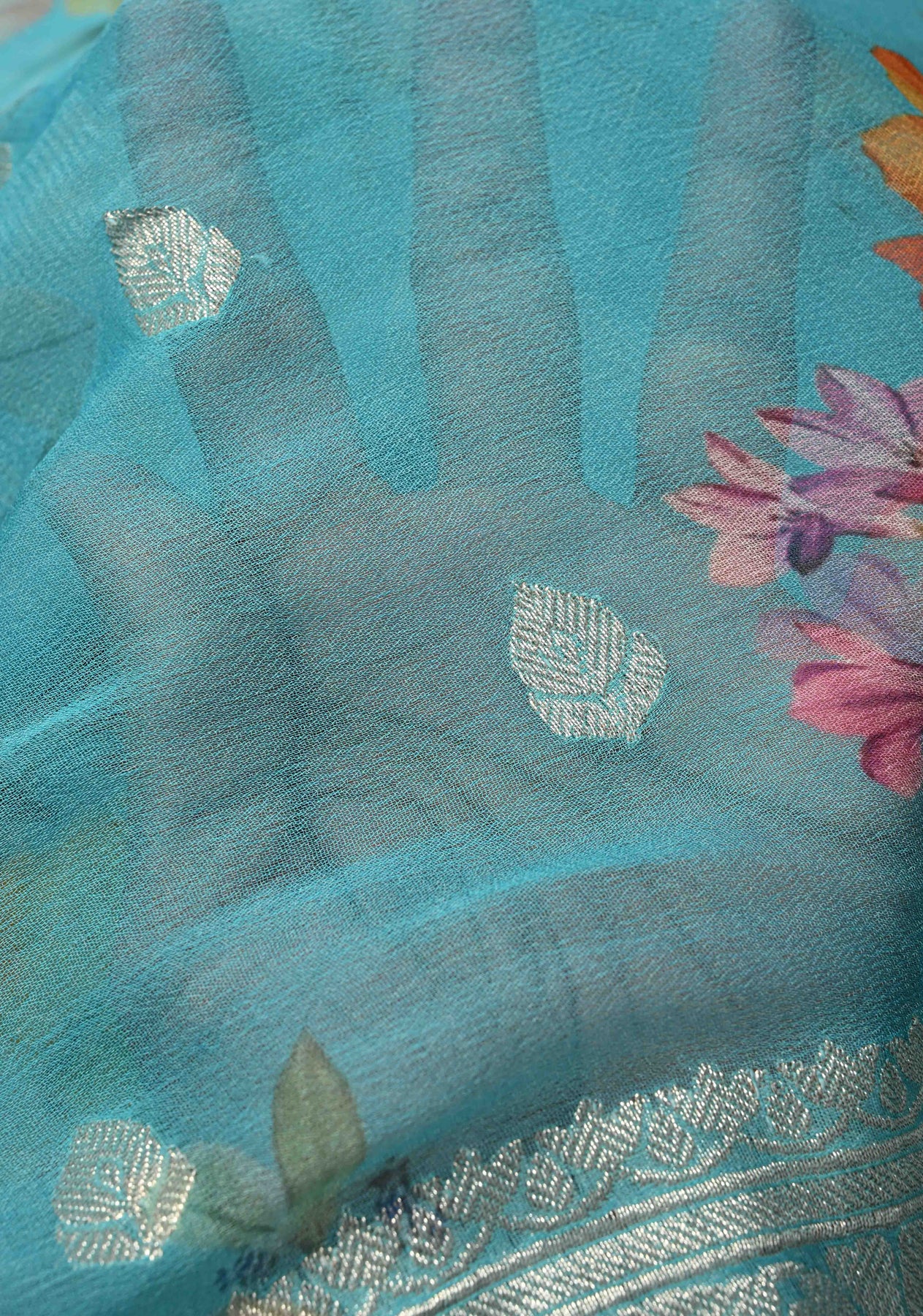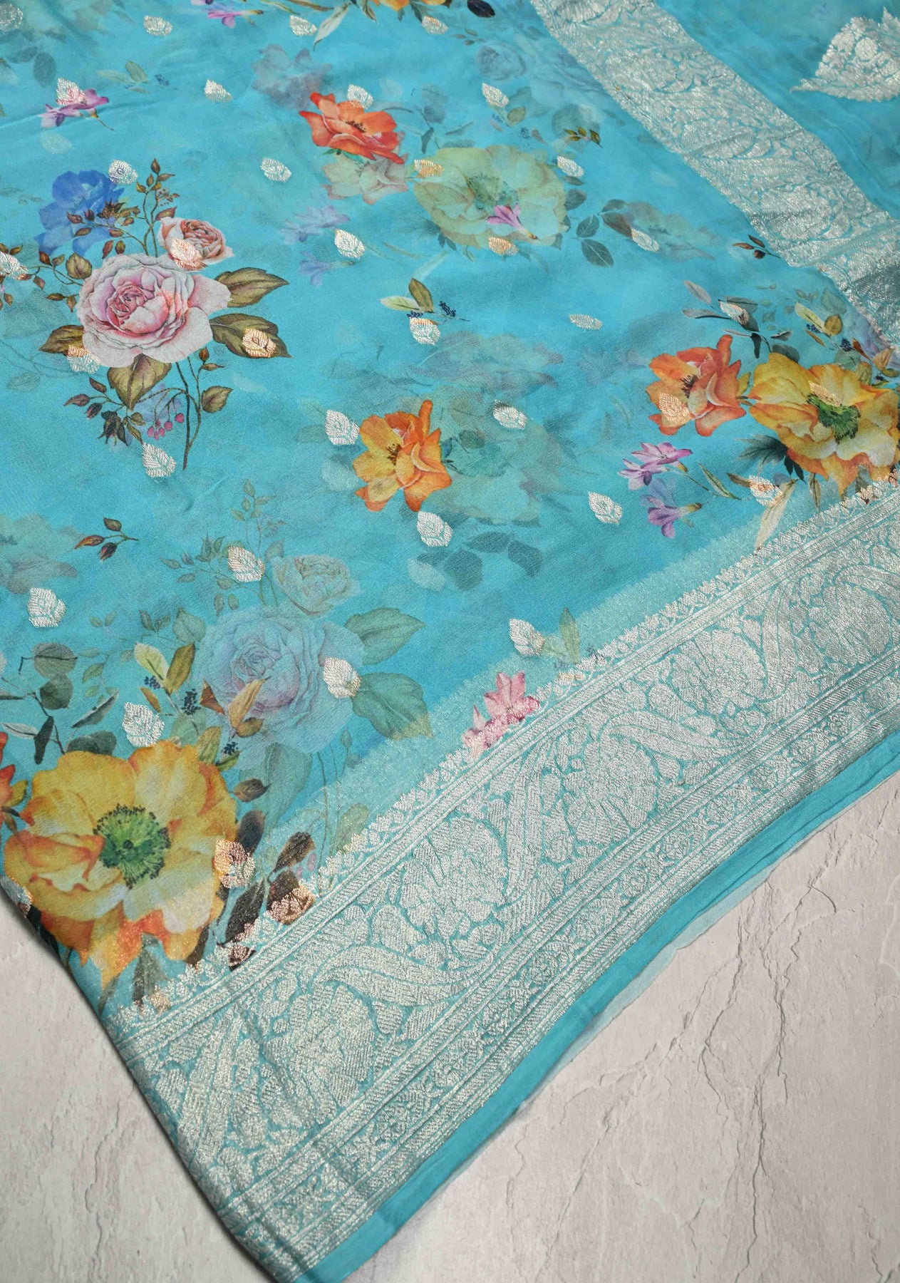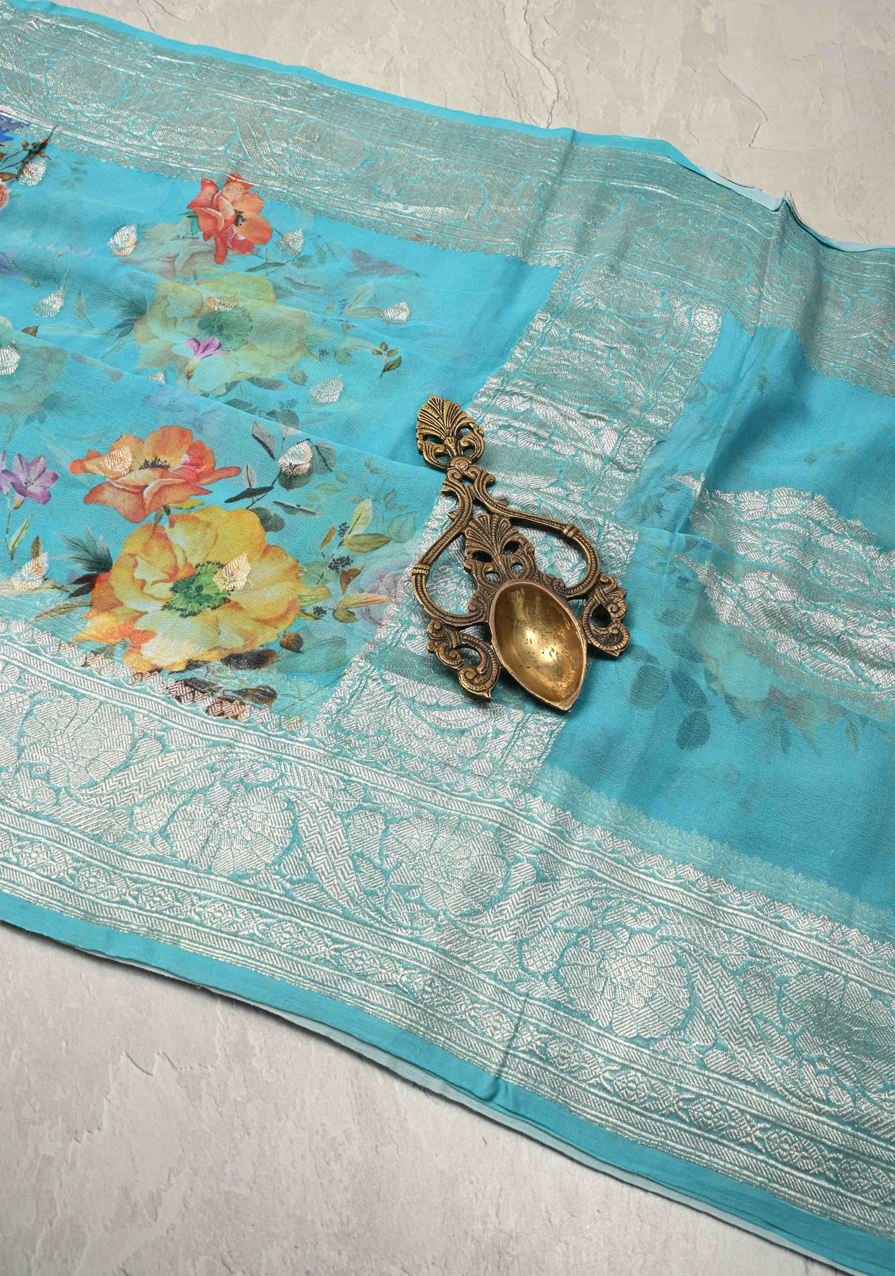 This Banarasi Pure Silk Chiffon Saree in Turquoise Blue captures a perfect blend of sophistication and charm. Adorned with graceful floral digital prints and glimmering zari buttas, it reflects the timeless beauty of Banarasi craftsmanship. The soft chiffon texture offers a lightweight, flowing drape, while the intricately woven zari border and pallu add a regal touch. Ideal for festive gatherings or elegant evening occasions, this saree radiates refined allure and effortless grace in every fold.