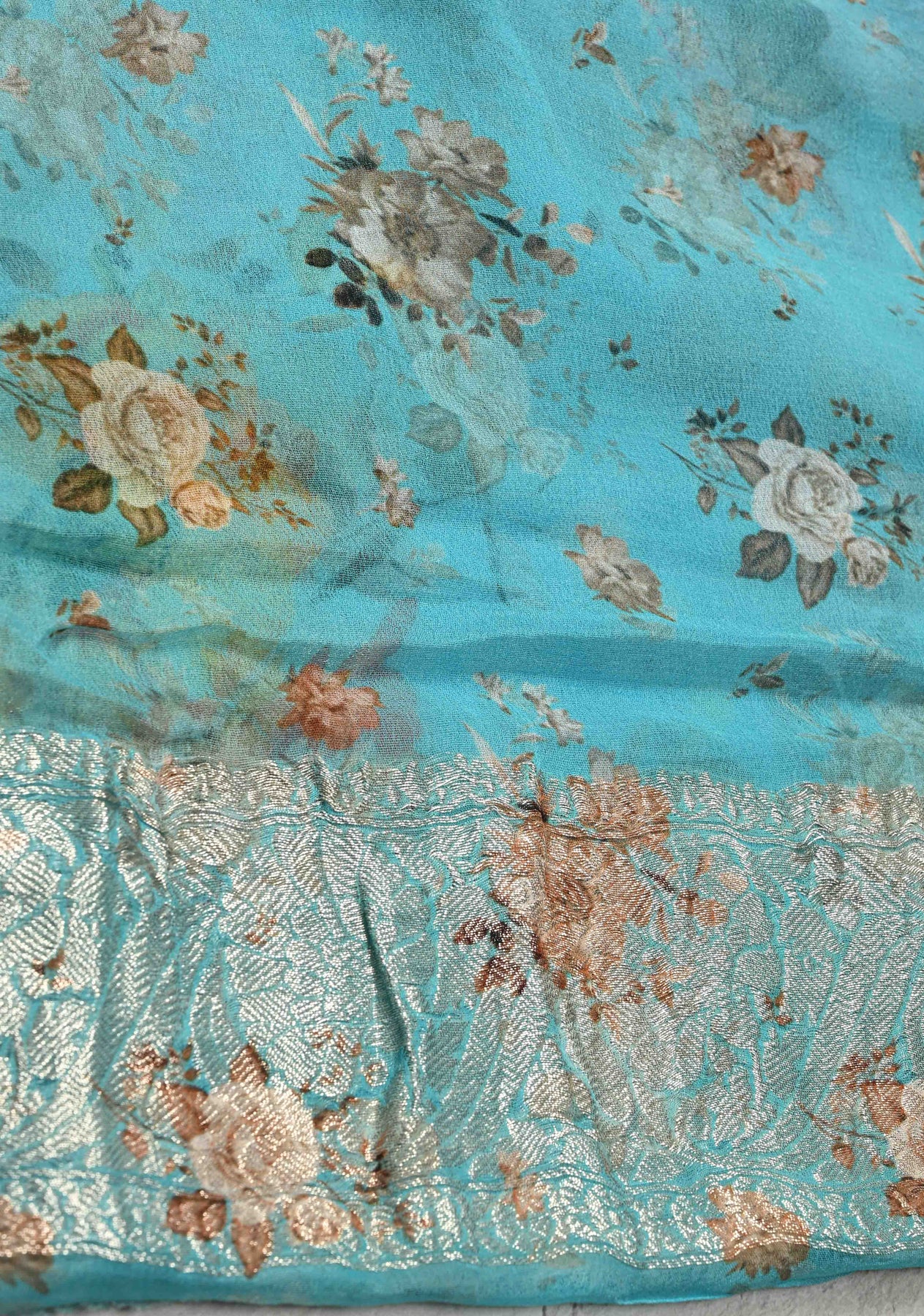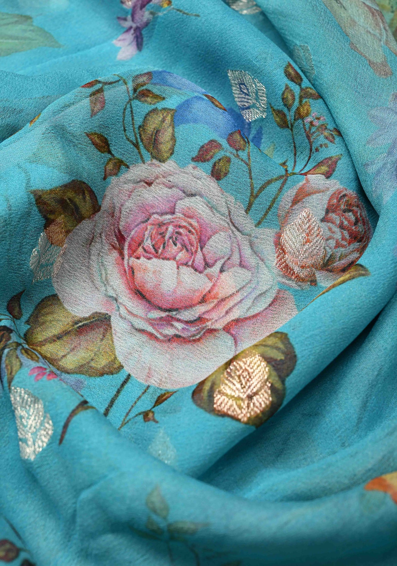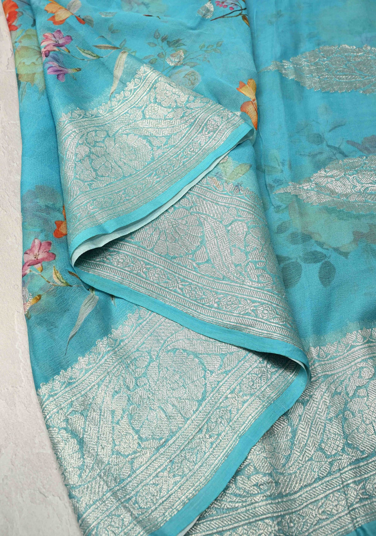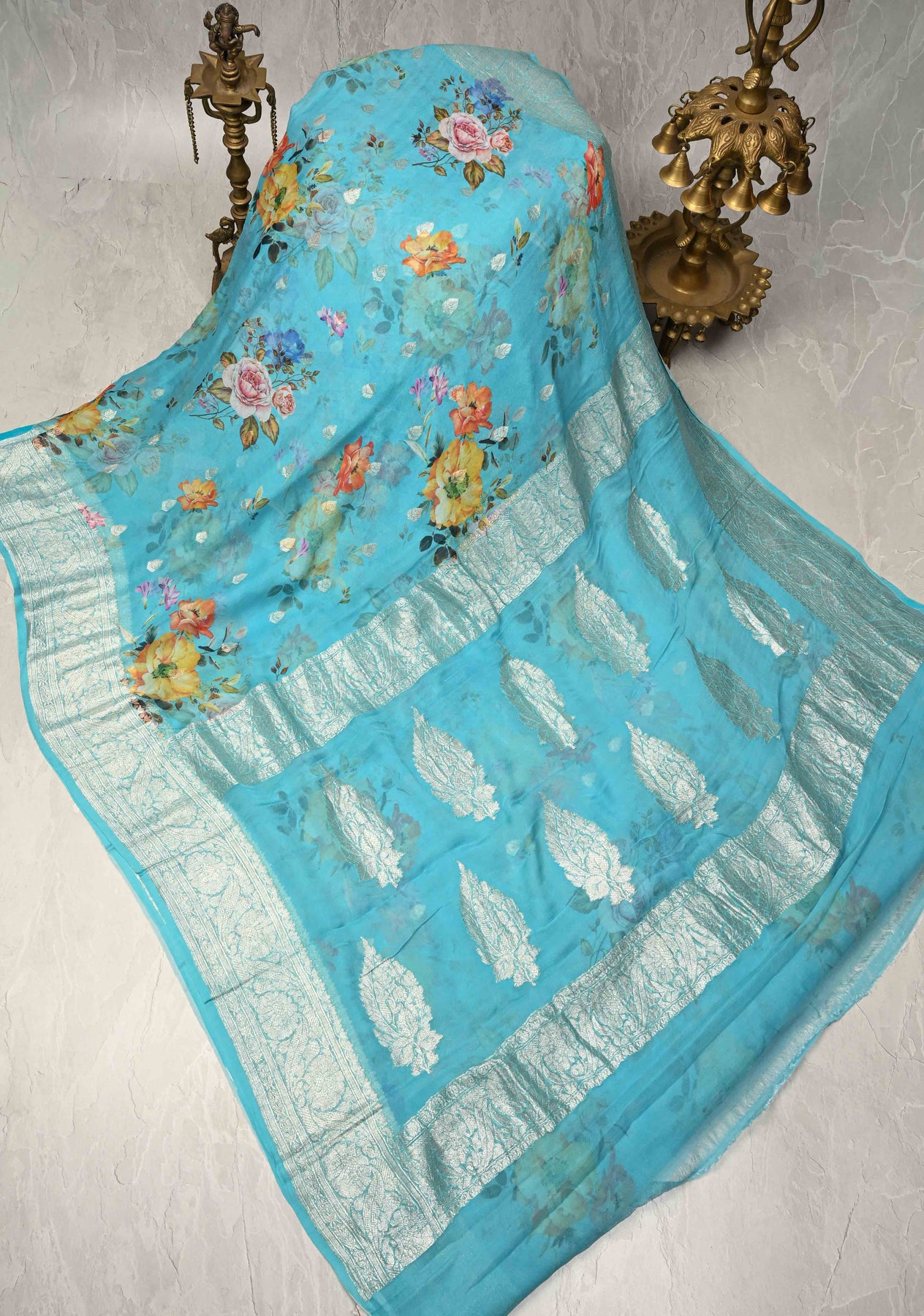 This Banarasi Pure Silk Chiffon Saree in Turquoise Blue captures a perfect blend of sophistication and charm. Adorned with graceful floral digital prints and glimmering zari buttas, it reflects the timeless beauty of Banarasi craftsmanship. The soft chiffon texture offers a lightweight, flowing drape, while the intricately woven zari border and pallu add a regal touch. Ideal for festive gatherings or elegant evening occasions, this saree radiates refined allure and effortless grace in every fold.