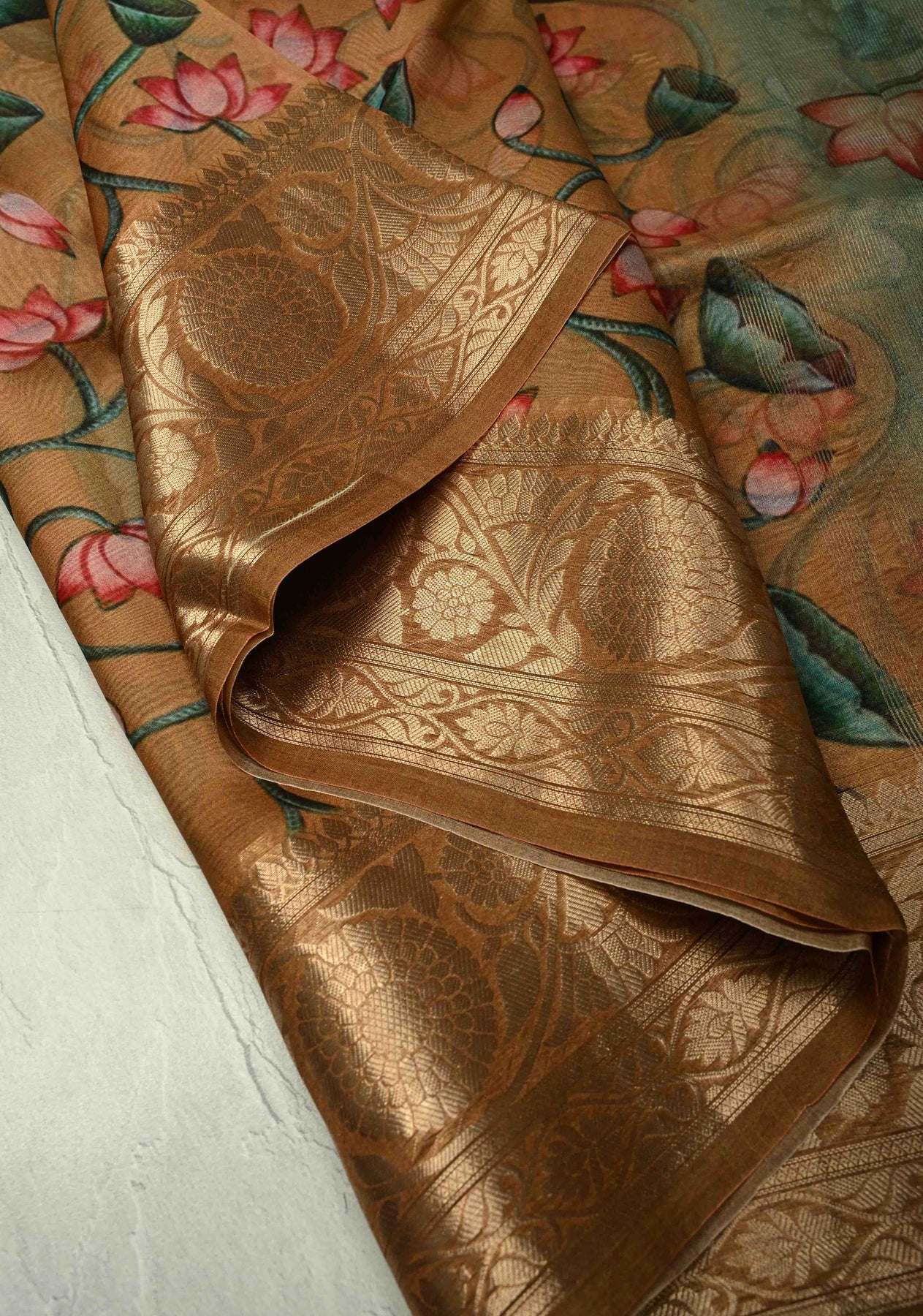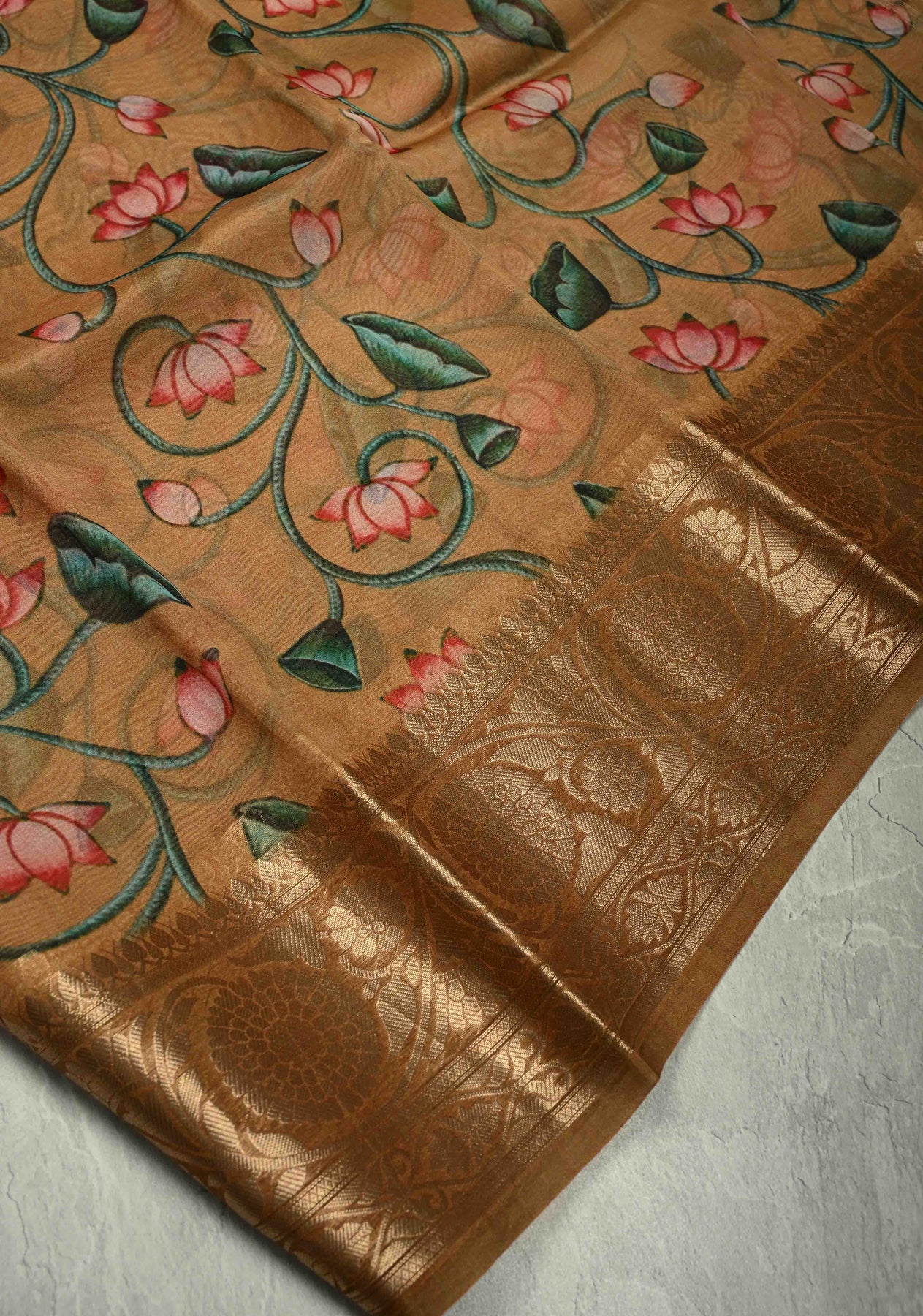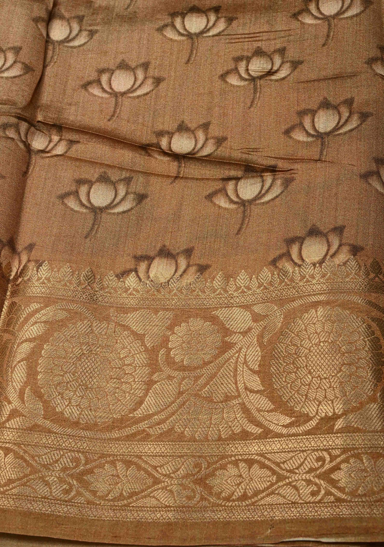 The highlight of this exquisite drape is its digital lotus floral print, delicately spread across the body — symbolizing purity and grace. The serene camel brown base provides the perfect canvas for the blooming lotus motifs, while the gold zari border and pallu add a touch of opulence and festive charm. Perfect for both formal and semi-formal occasions, this saree effortlessly blends earthy tones with artistic sophistication.