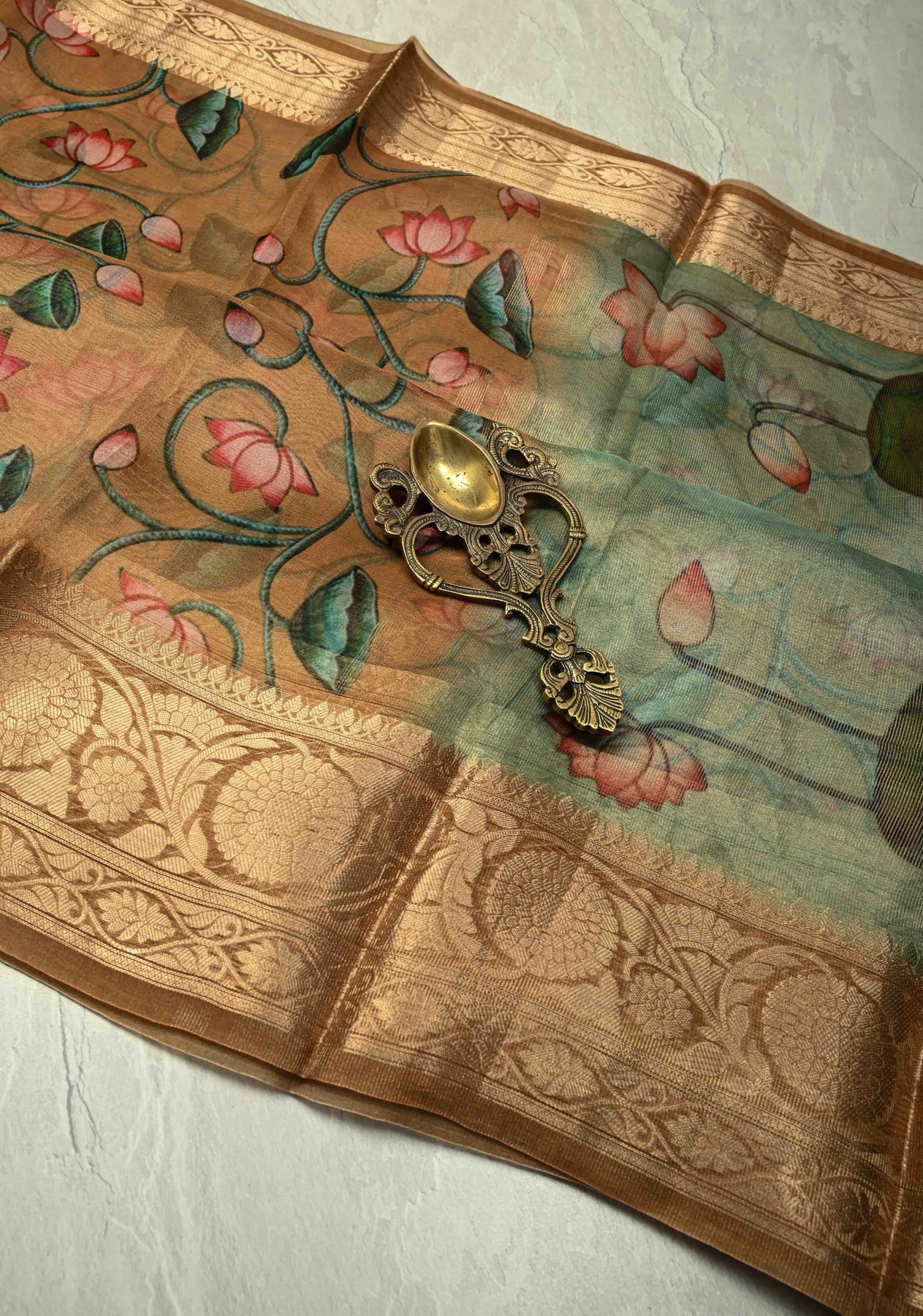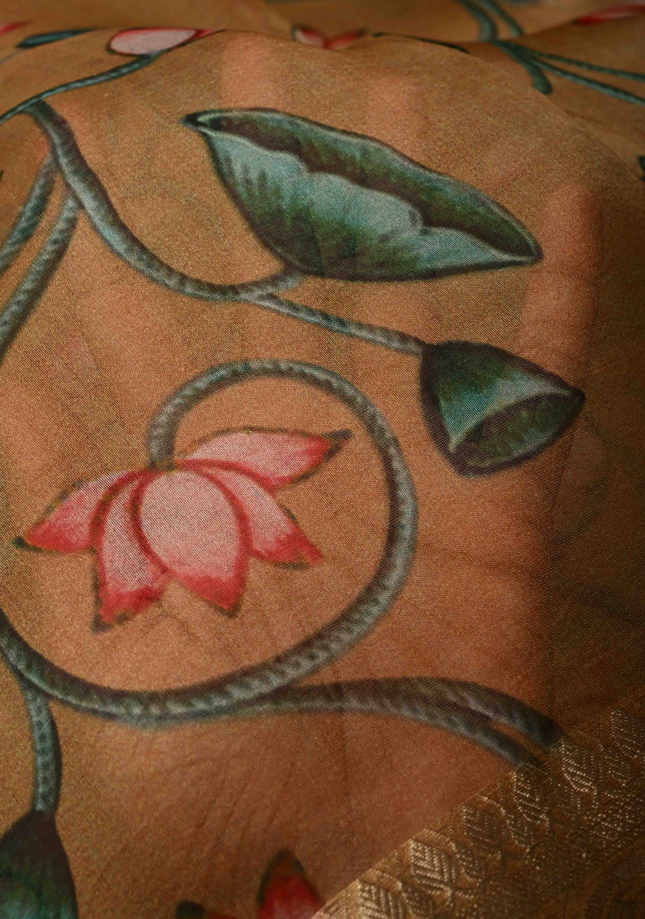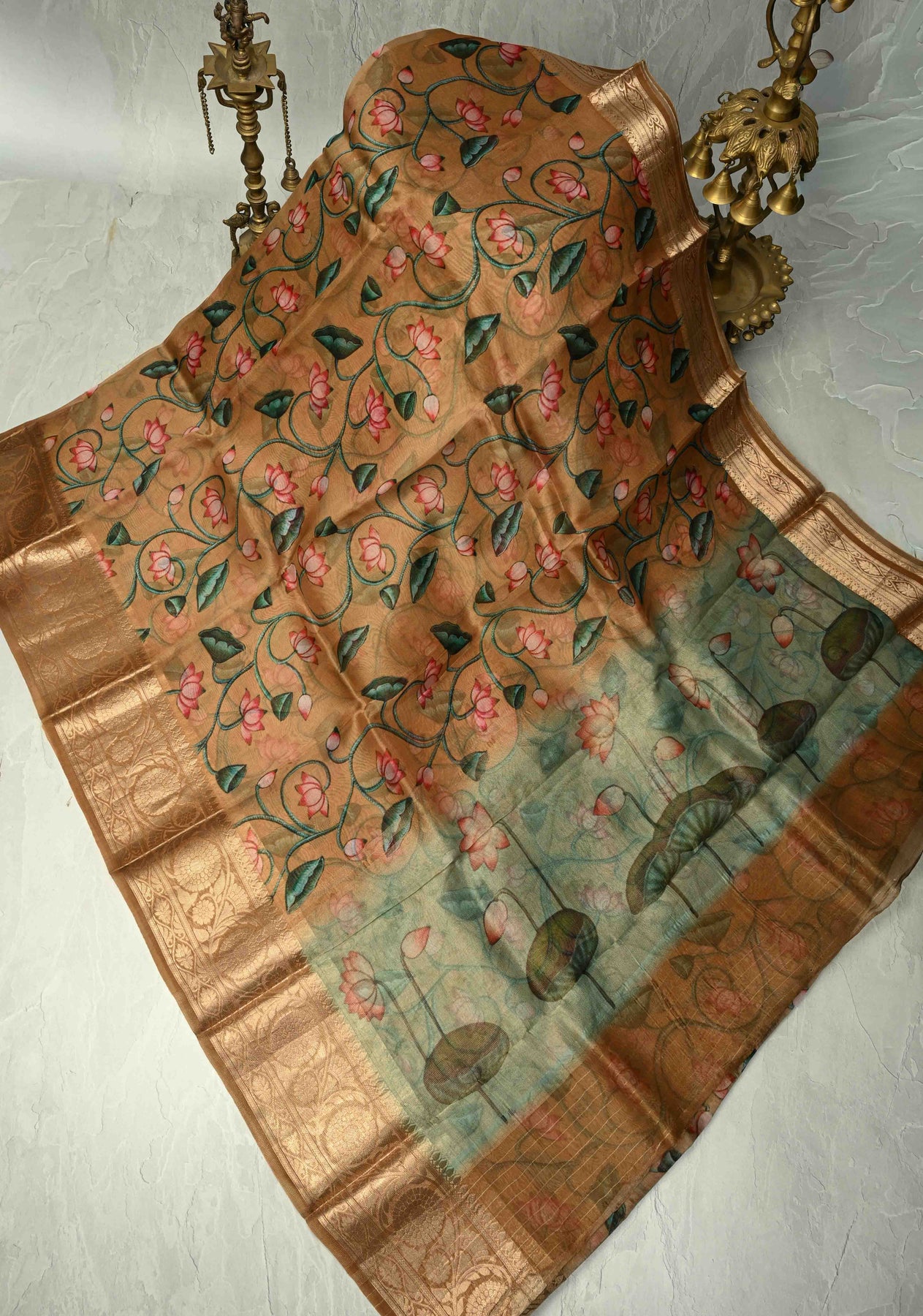 The highlight of this exquisite drape is its digital lotus floral print, delicately spread across the body — symbolizing purity and grace. The serene camel brown base provides the perfect canvas for the blooming lotus motifs, while the gold zari border and pallu add a touch of opulence and festive charm. Perfect for both formal and semi-formal occasions, this saree effortlessly blends earthy tones with artistic sophistication.